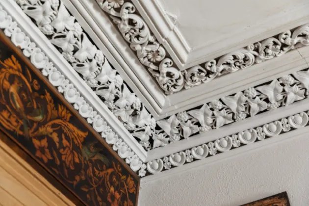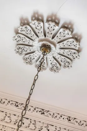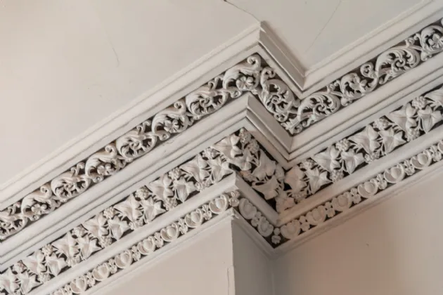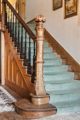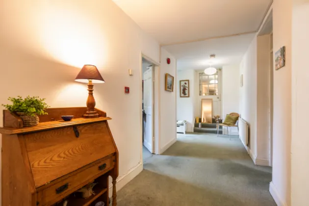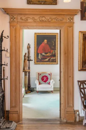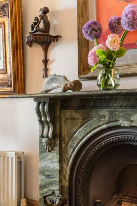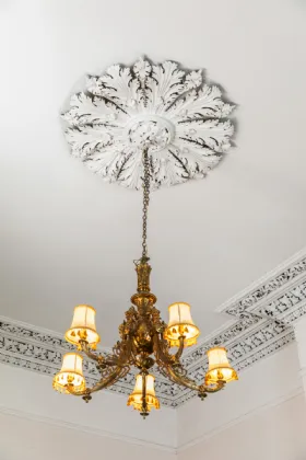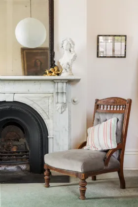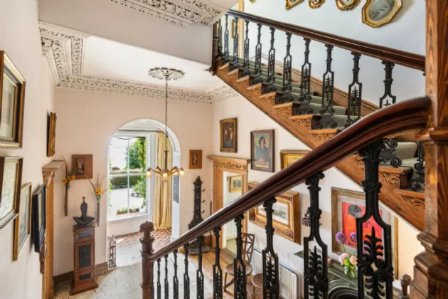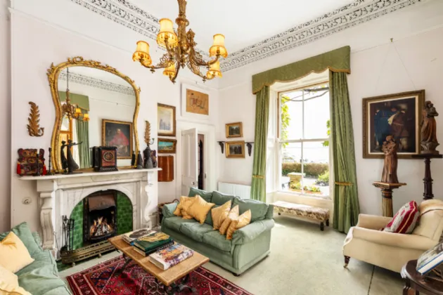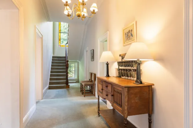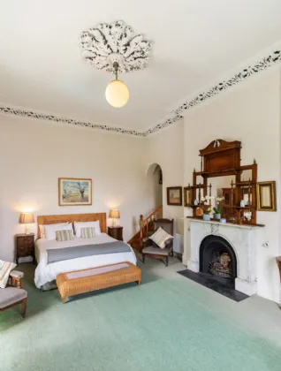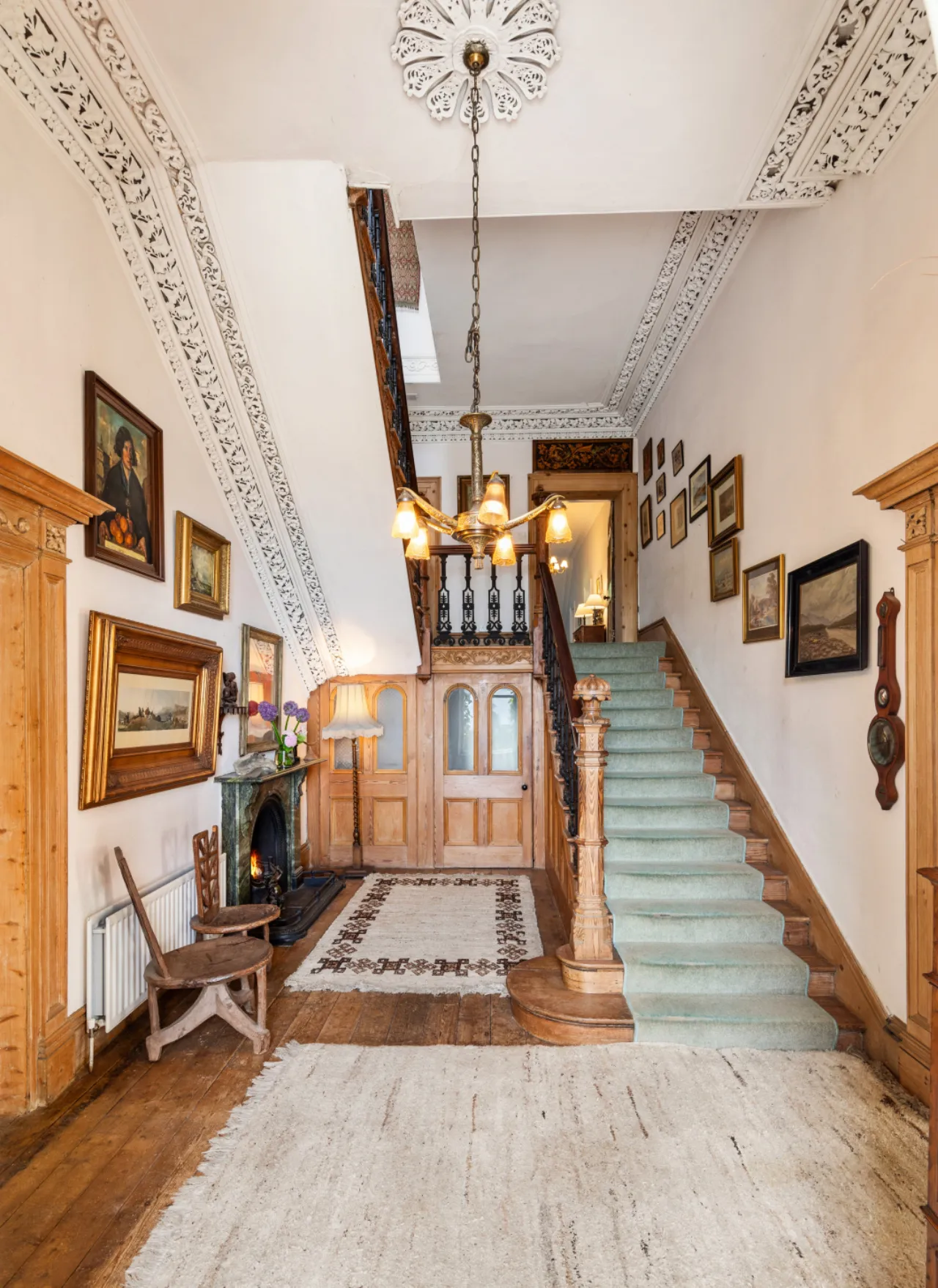 Entrance Hall: with original timber floorboards, green marble fireplace with open fire. Attractive staircase and balustrade, wonderfully ornate and intricate ceiling coving and cornicing. Ceiling height of 4.2 m