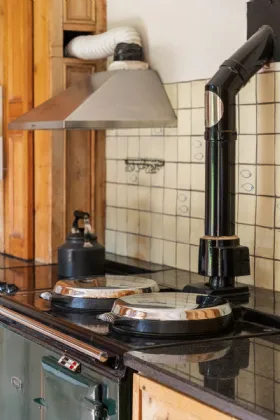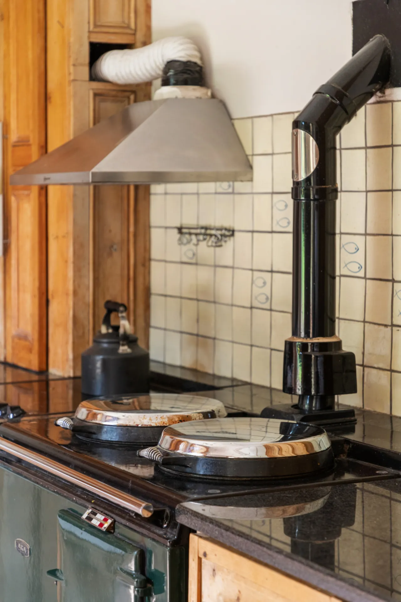 Kitchen: homely, country style tiled floor kitchen with stripped pine kitchen units and eye level units with a tiled splashback and black marble countertops. Double Belfast sink, AGA, Zanussi electric oven and extractor.