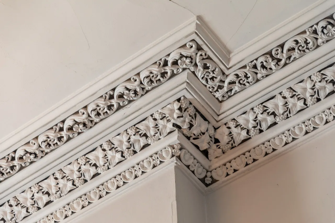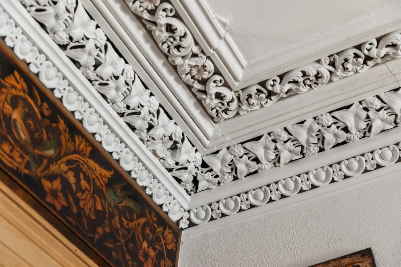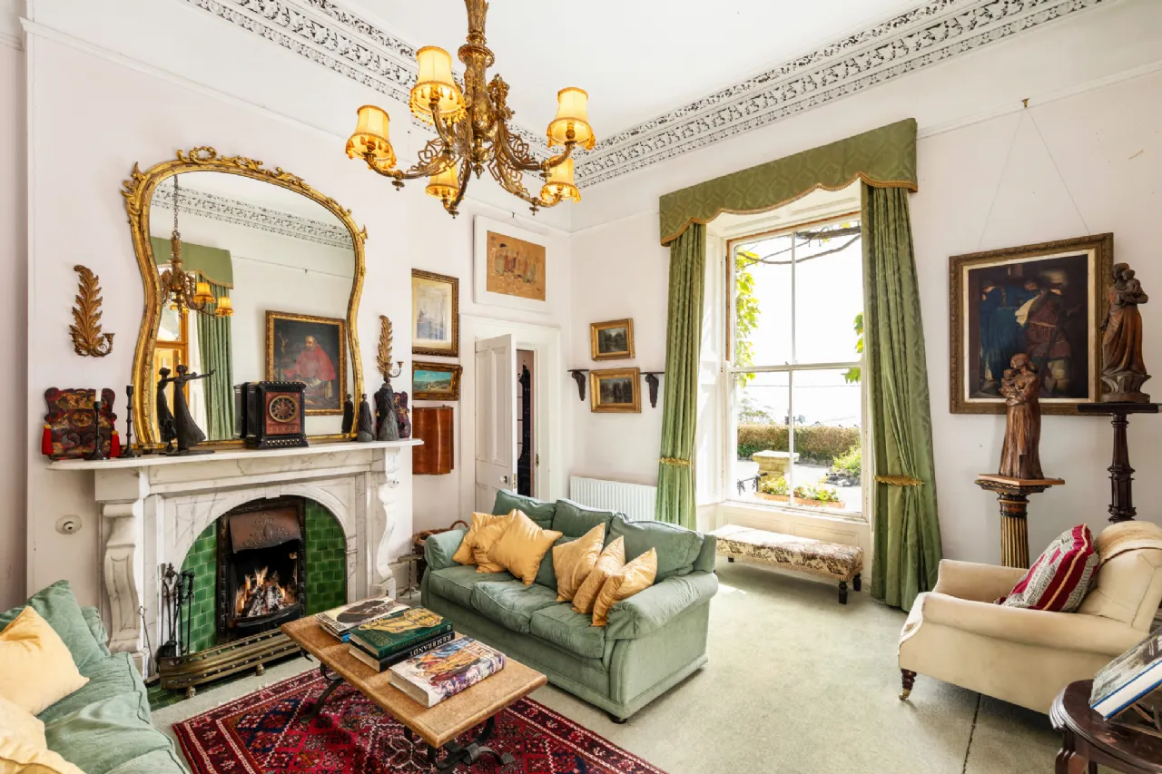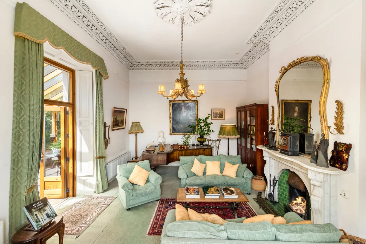 Upon entering the impressive main hall, you are greeted by two exquisite formal reception rooms, the drawing room with double-aspect windows, intricate and ornate ceiling coving throughout, and attractive marble fireplaces.