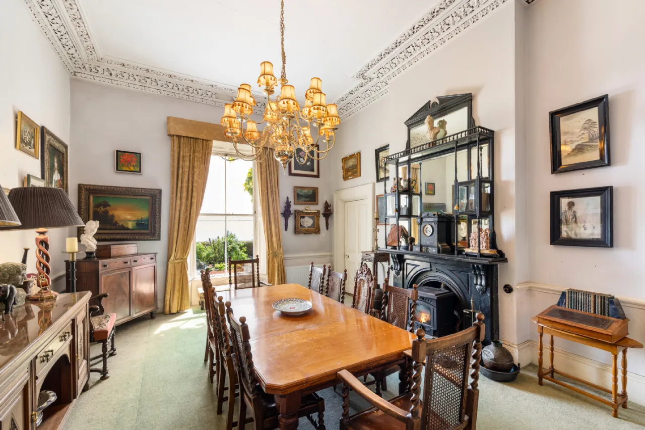 Dining Room: stunning room with dado rail, intricate ceiling coving and cornicing. Black marble fireplace with wood burning stove. Ceiling height of 4.2m. Door to butler’s pantry