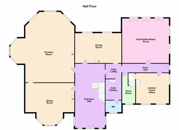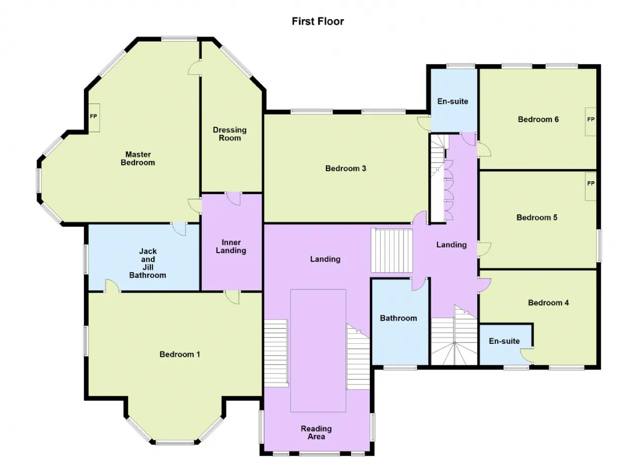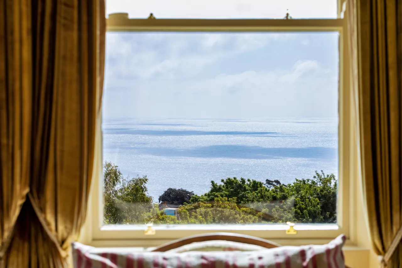 Main Bedroom Stunning double fronted bedroom with bay window enjoying commanding views overlooking the grounds out towards the Bay. Solid oak floors, marble fireplace with gas fire. French Toile do Jouy wallpaper in golden hues.