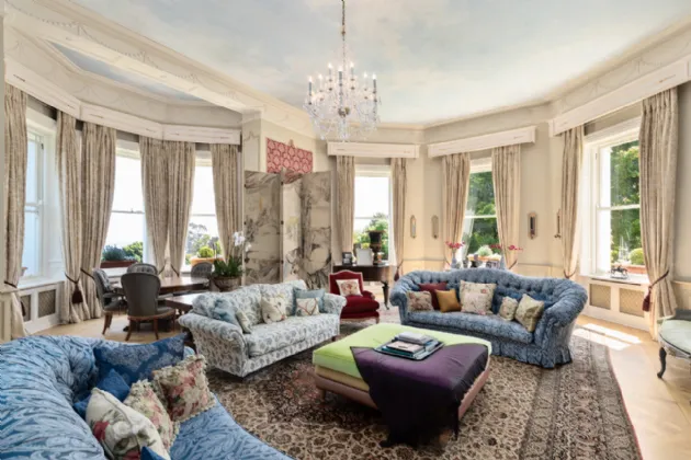 Drawing Room with double bay windows, dual aspect, Versaille parquet floor, marble fireplace with gas fire, large bay reflecting light and opening to sea views. Richly decorated with wainscotting, ornate wall detailing with gilded accents.