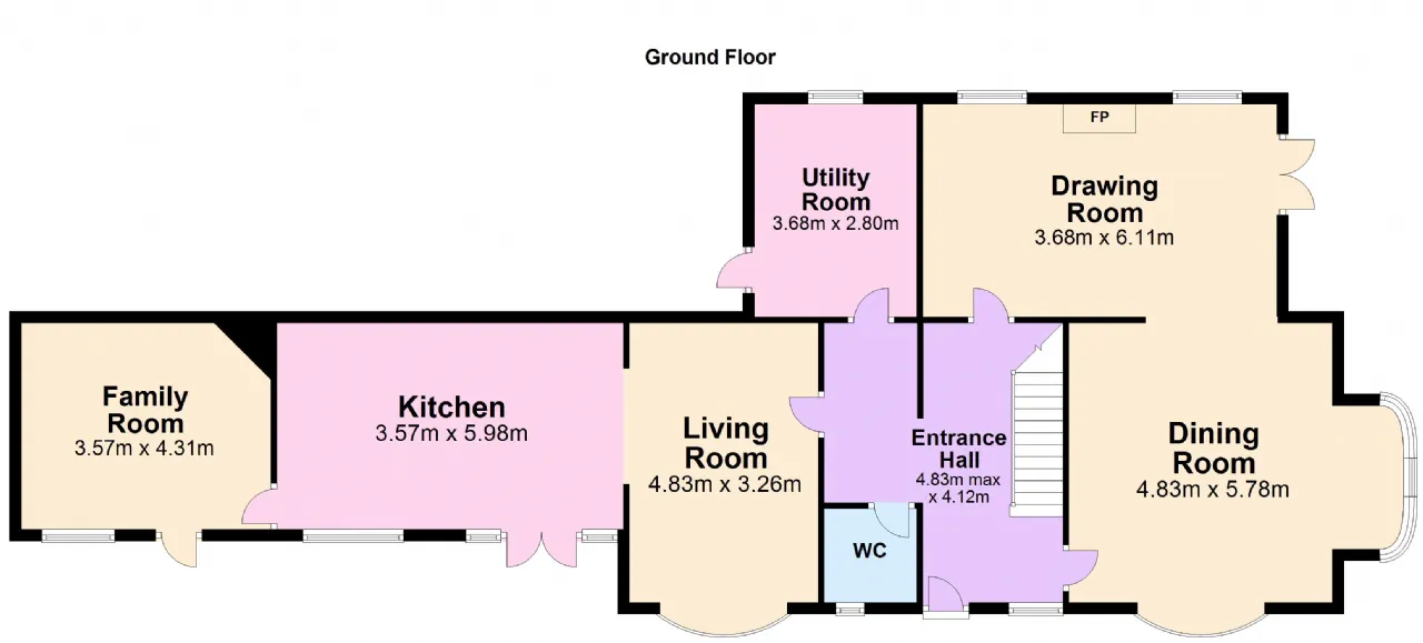 Dining Room bright and spacious room to the front of the property with pine flooring, floor to ceiling windows and two steps leading up to the drawing room.