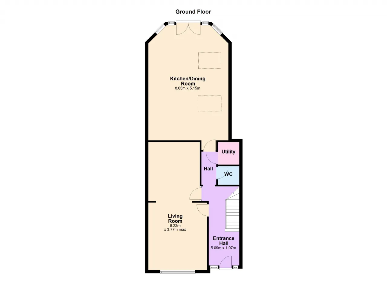 Kitchen/ Dining/ Living Area 8.03m x 5.15m Large area with newly fitted and tiled kitchen including generous counter-top space. Sufficient space can allow for a large dining table and chairs. Large living area with Bay windows with double doors leading to the rear patio and garden. Two skylights provide the space with natural lighting all day long.