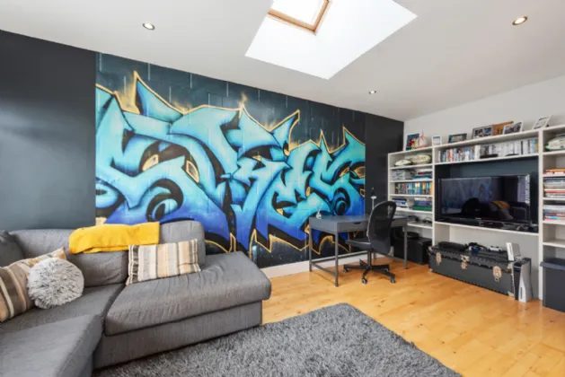 T.V. Room 2.60m x 5.41m Solid timber flooring, recessed lighting, Velux window and window to front.