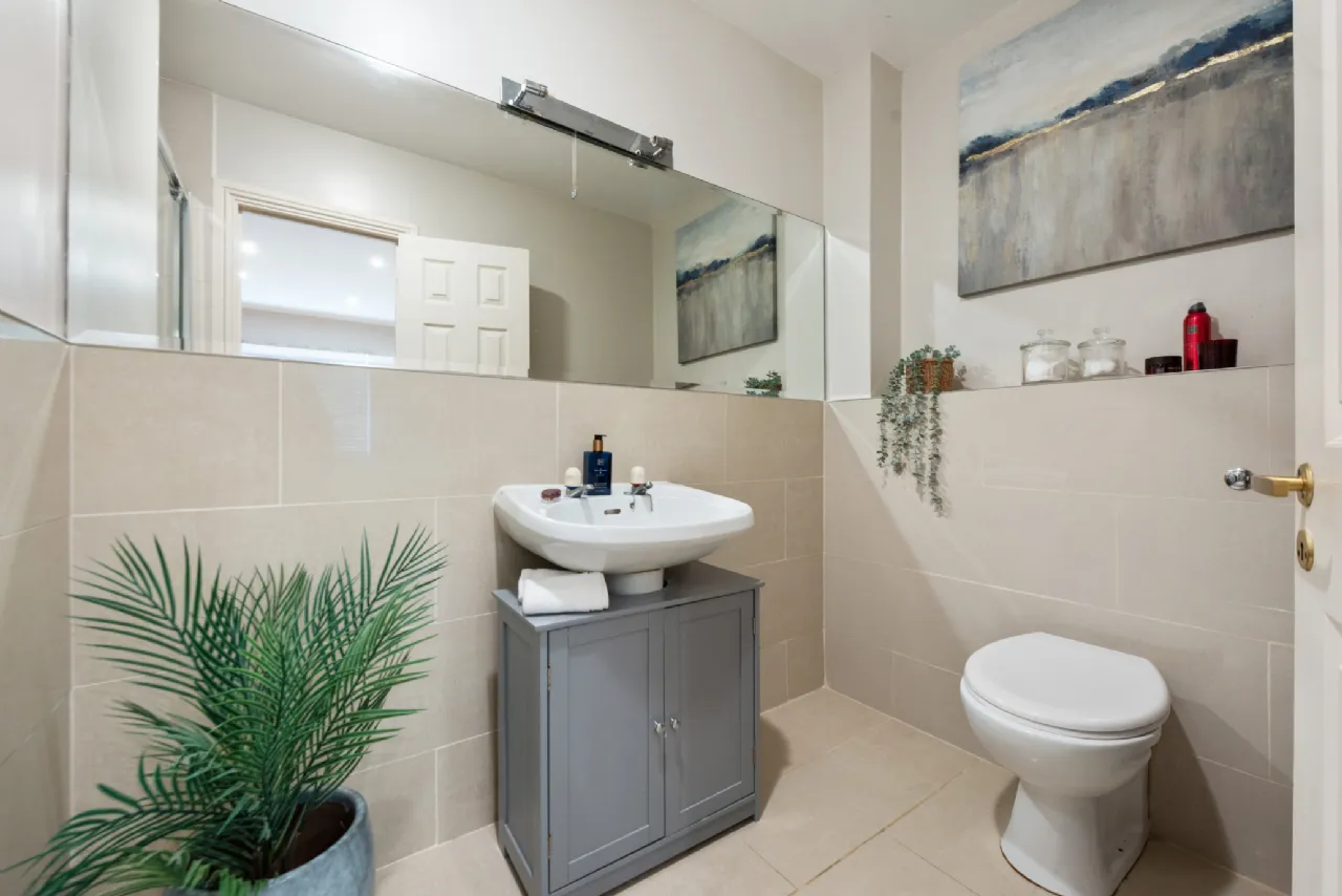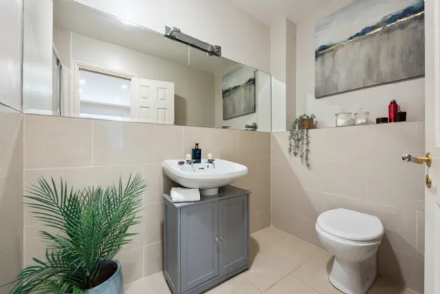 Guest w.c. 0.70m x 1.50m Tiled flooring, wash hand basin with under sink storage, tiled splash back and w.c.