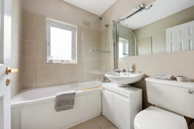 Bathroom 1.90m x 1.60m Tiled flooring and partially tiled walls, bath with shower attachment and glass surround, wash hand basin with under sink storage, w.c. and window to side.