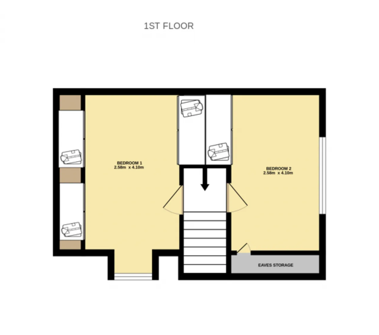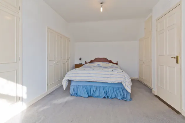 Bedroom 1 2.58m x 4.10m Large double with carpet flooring, fitted wardrobes and under eaves storage and window to front.