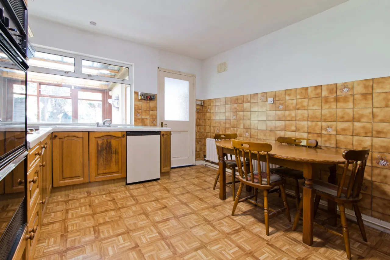 Kitchen 3.40m x 3.93m Solid oak fully fitted kitchen with floor and eye level units, partially tiled walls and splashback, stainless steel sink and drainer, integrated appliances include, grill, oven, electric hob and extraction unit, window and door to rear.