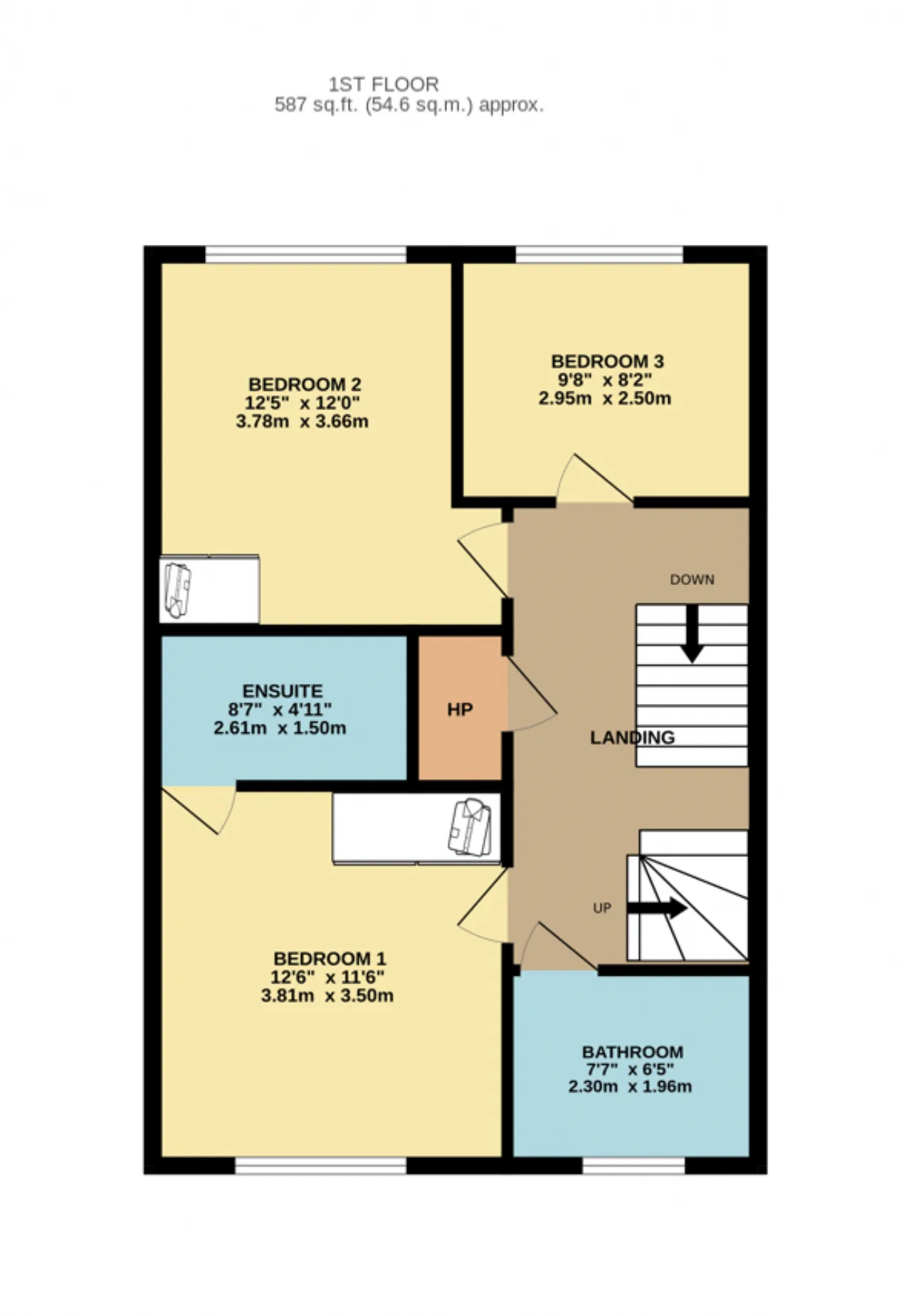 En-Suite 1.5m x 2.61m A modern ensuite finished to a high standard, featuring sleek white sanitary ware, chrome fittings, and beautifully tiled walls and floors complete with WC, WHB and walk in shower.