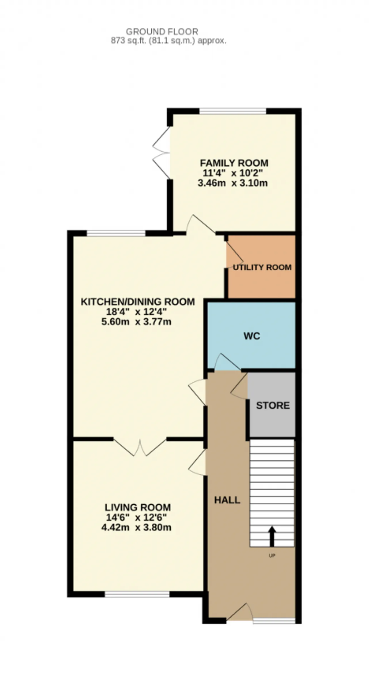 Family Room 3.46m x 3.10m A versatile and bright room with laminate flooring and large patio doors leading directly to the rear garden, currently used as a play area
