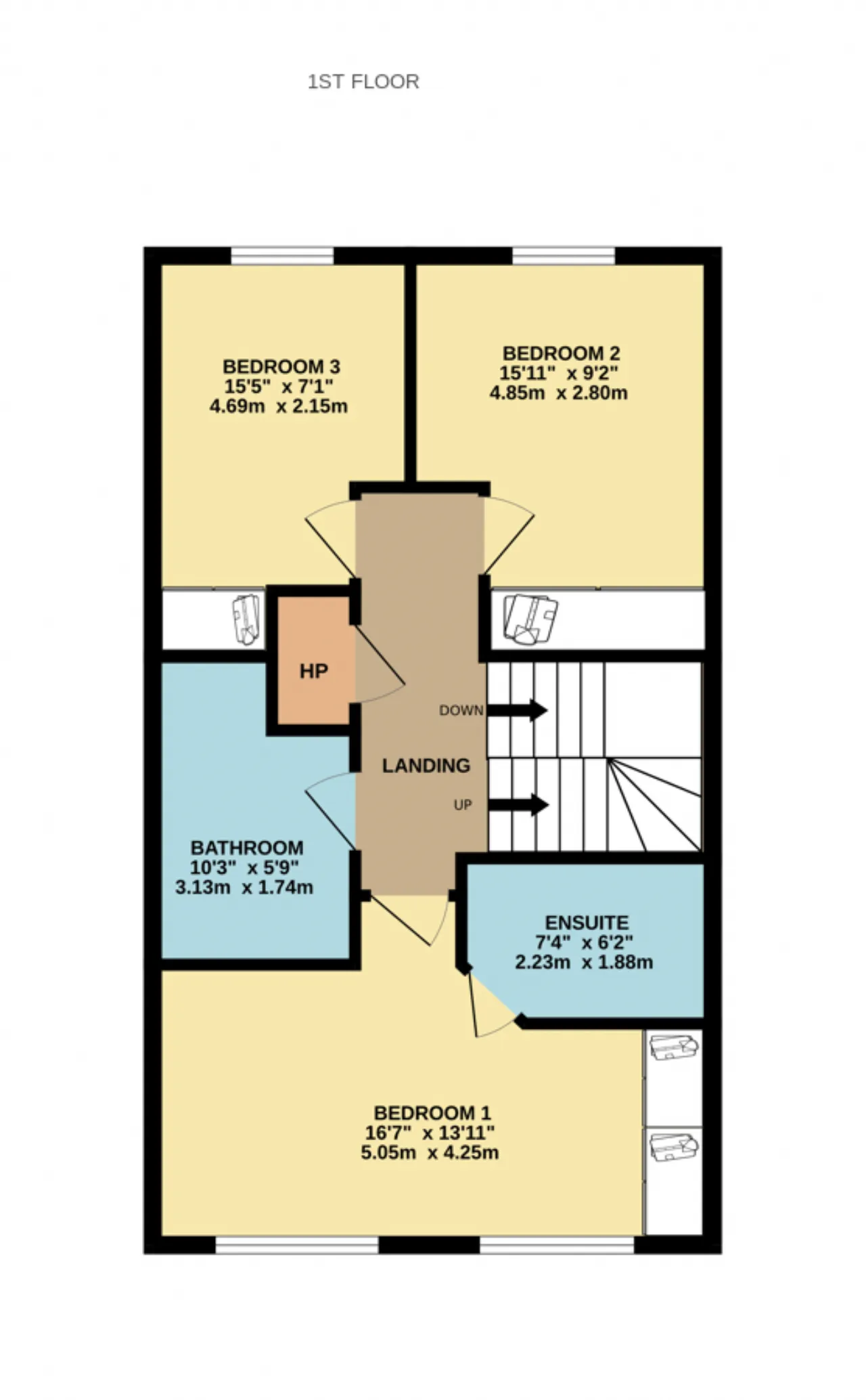 Bedroom 1 5.05m x 4.25m A generous full-width double bedroom located to the front of the property. The room benefits from excellent natural light through twin windows and includes laminate flooring, built-in wardrobes, and a private en-suite.