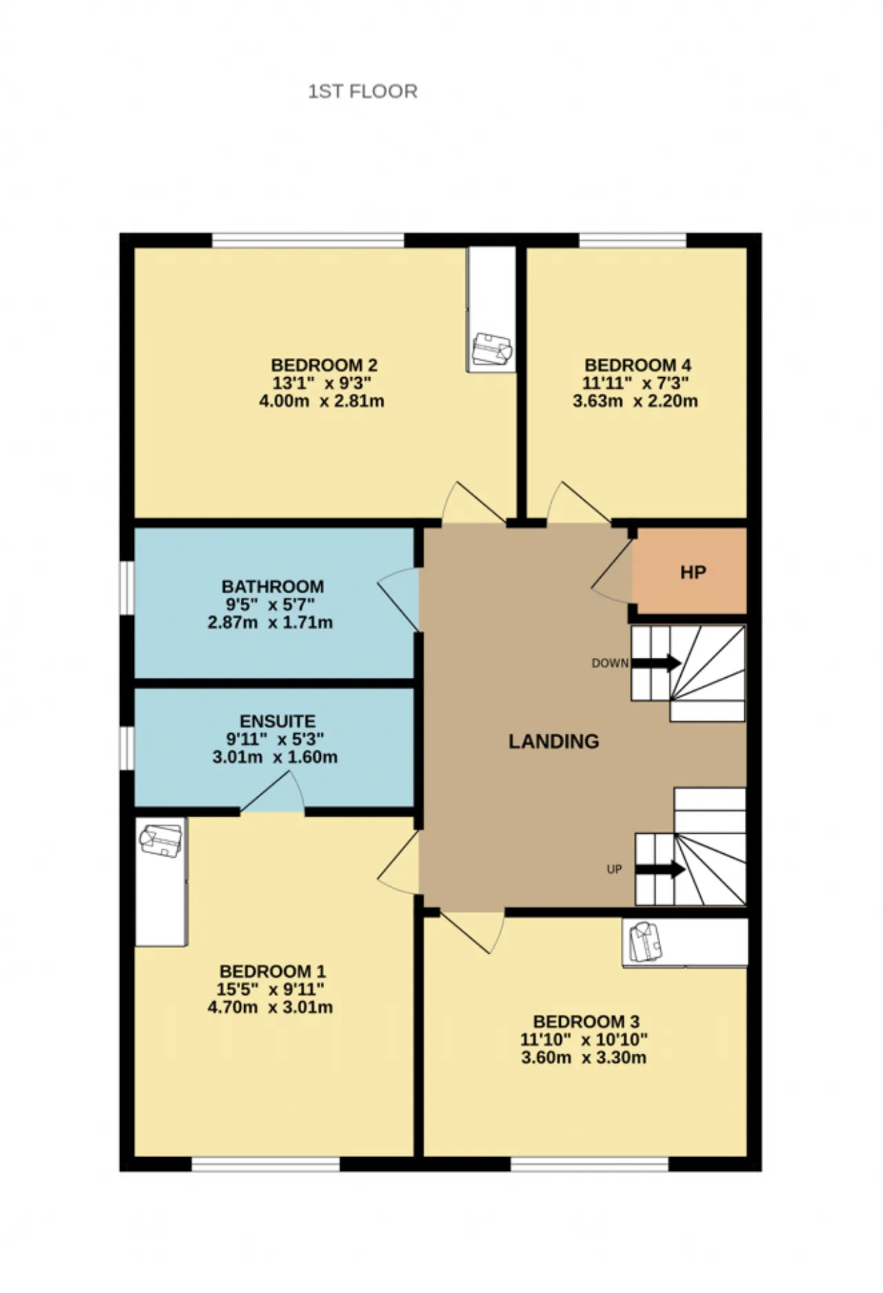 Bedroom 1 4.70m x 3.01m A spacious double bedroom positioned at the front of the property, featuring carpeted flooring, a large picture-frame window, and built-in wardrobes, complemented by a private ensuite.