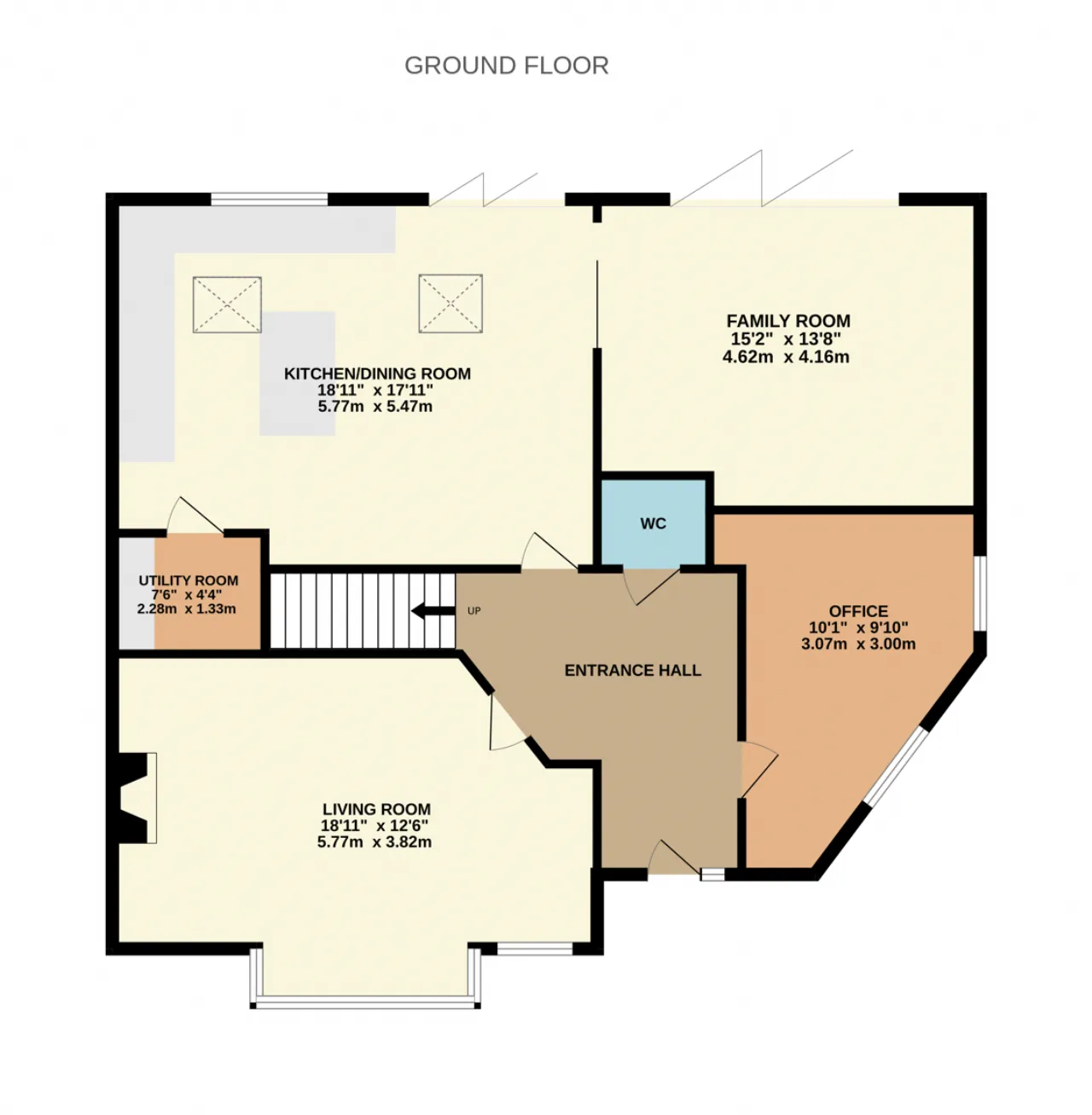 Office 4.27m x 3.25m Located off the hall to the front, this room offers a dedicated, private space ideal for remote working or use as a quiet children's play area.