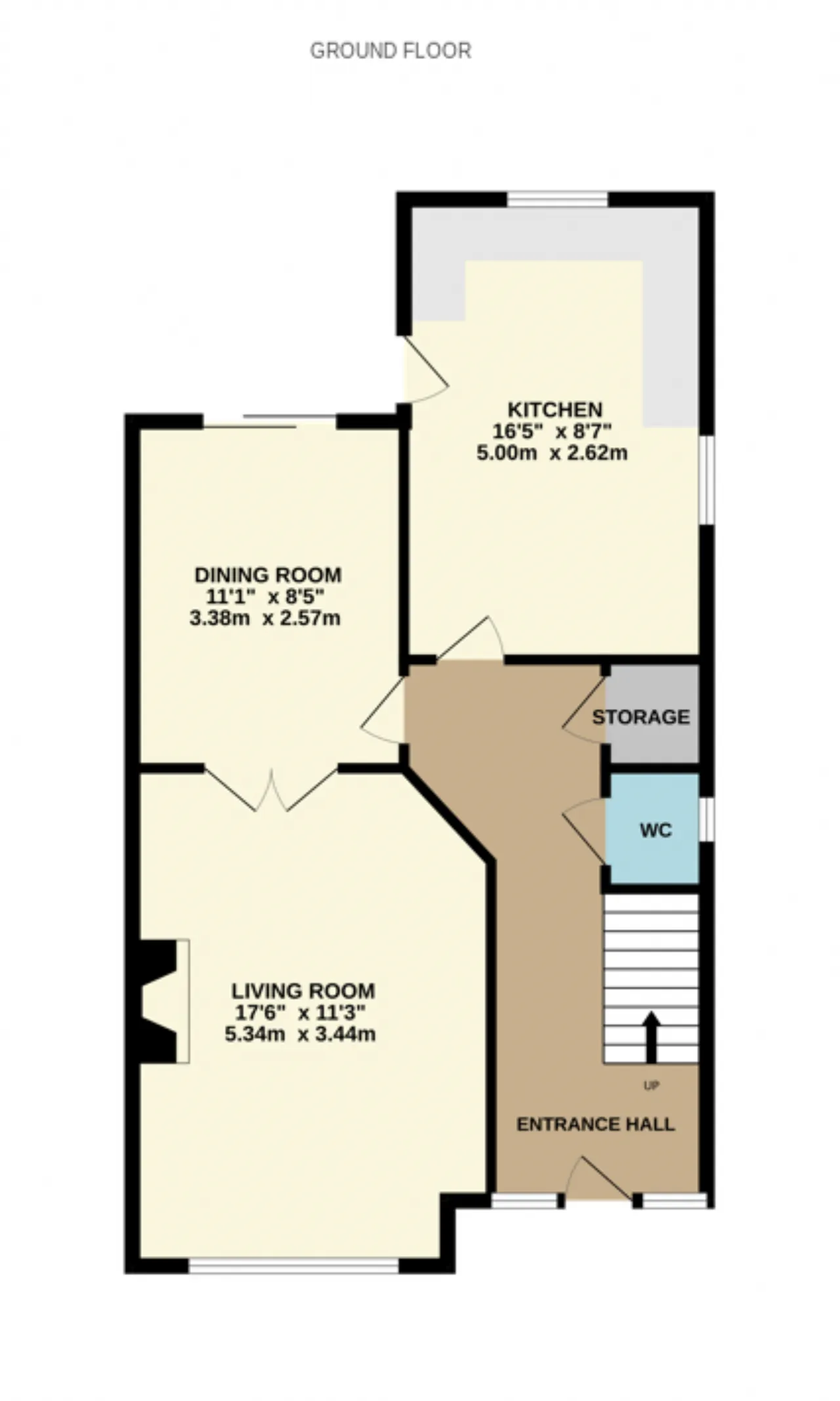 Living Room 5.34m x 3.44m Located to the left of the entrance hall is this impressive living room centered around an open fireplace. The living space features bay windows flooding the room with natural light, ceiling coving, ceiling rose and double doors leading seamlessly into the dining room.
