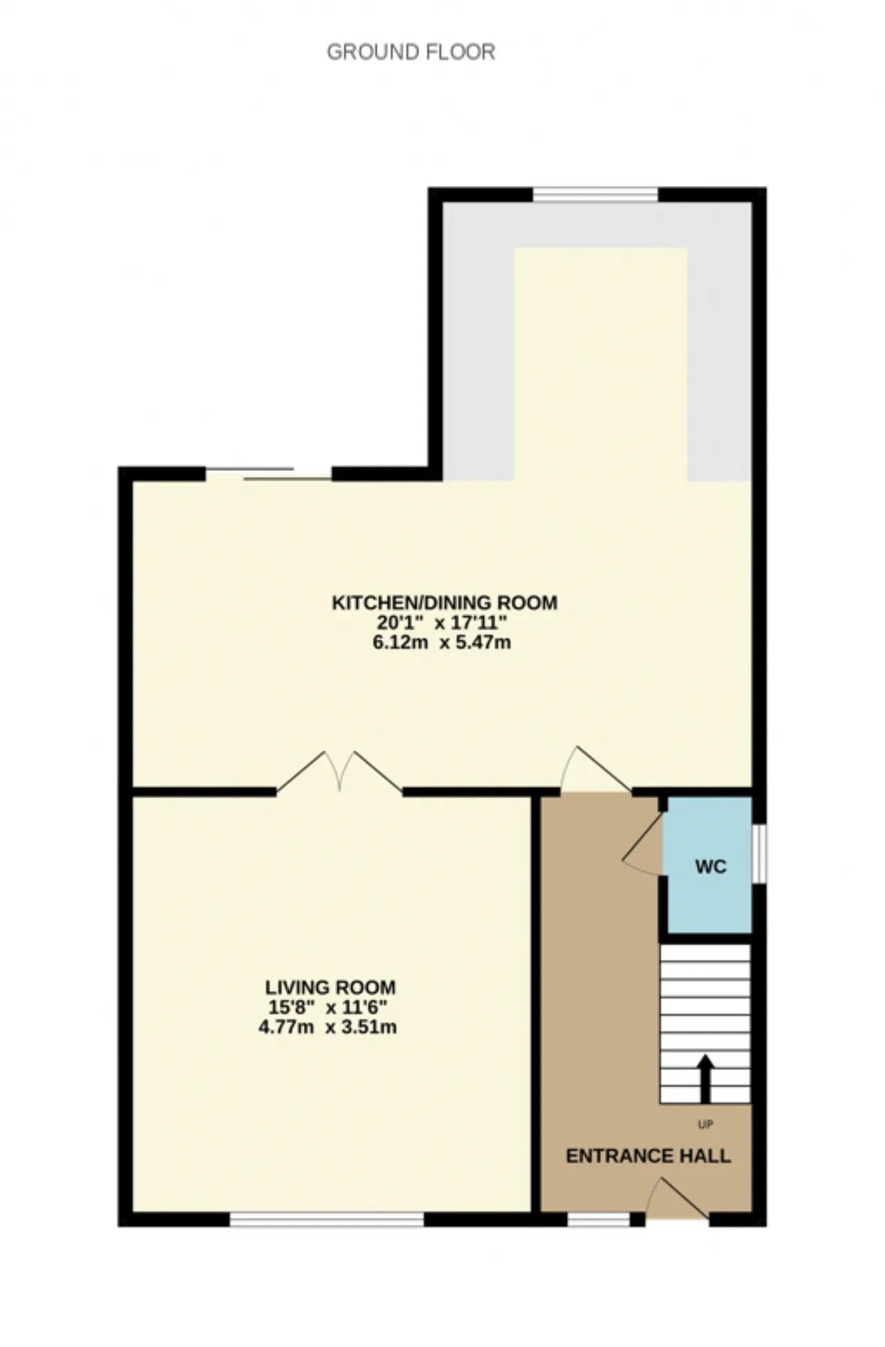Guest WC 1.47m x 0.76 Neatly tucked under the stairs is this well-appointed guest WC featuring tiled flooring, WC and WHB.
