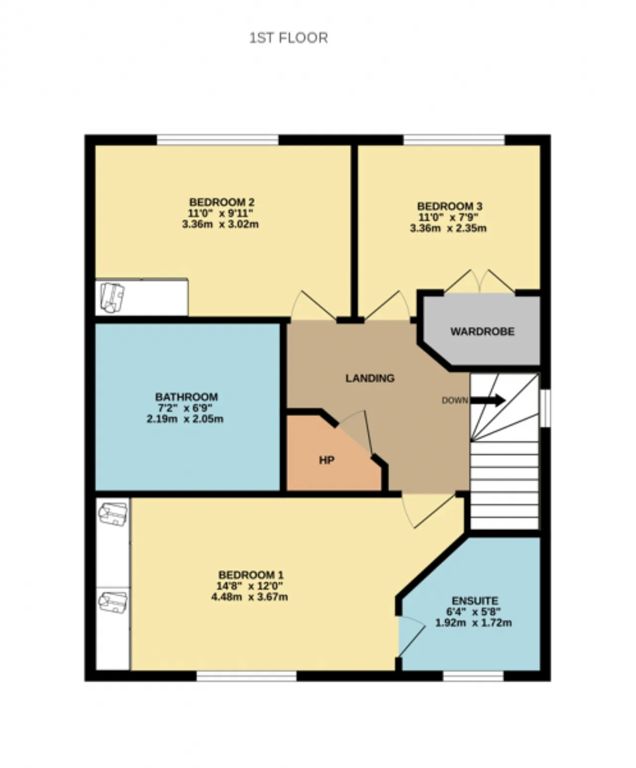 En-Suite 1.92m x 1.72m Practical and spacious featuring WC, WHB and stand-alone shower with tiled splash back and pump showerhead.