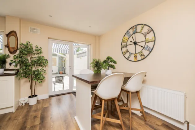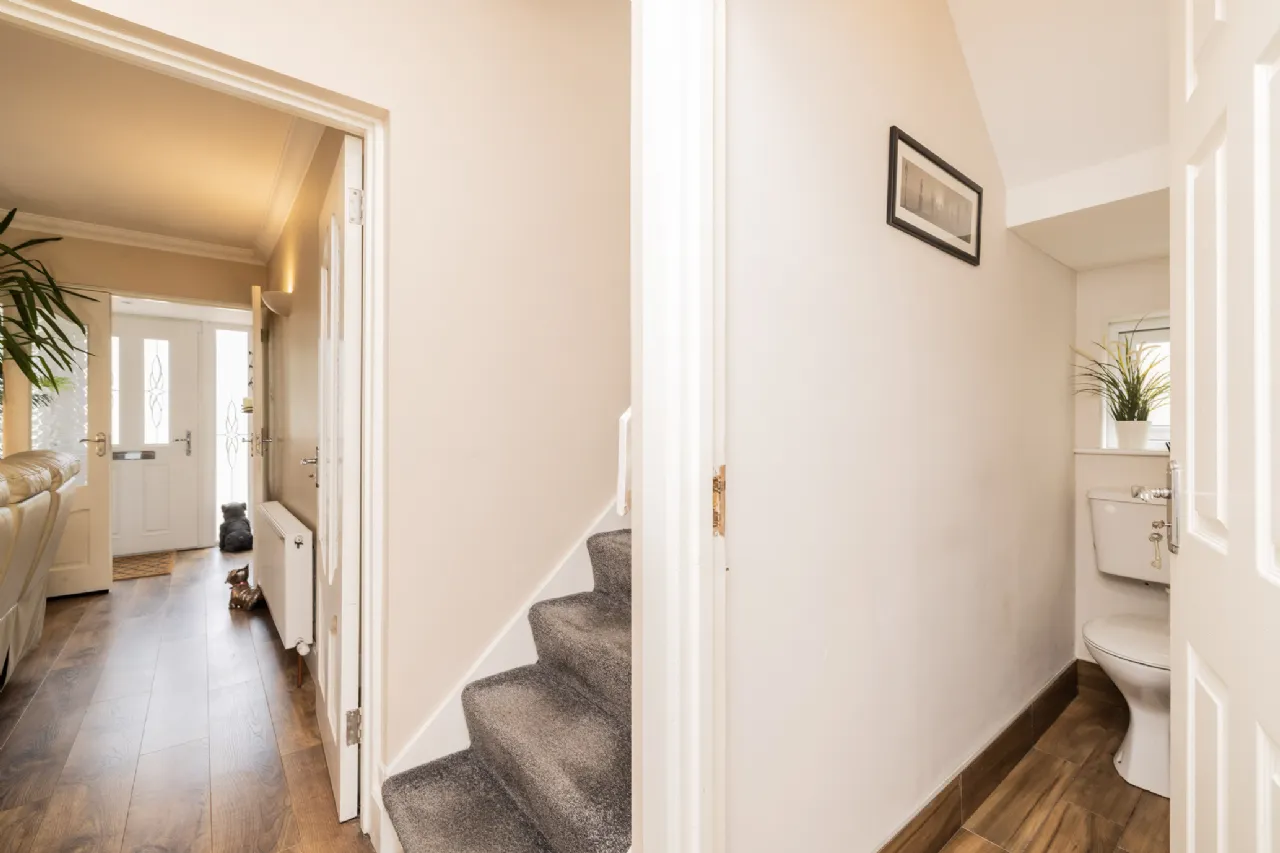 Outside, the front garden offers private off-street parking for multiple cars and convenient side access to the beautifully maintained rear garden. The rear garden features a mix of paving and mature planting, along with a large garden shed for extra storage. Orlynn Park offers easy access to Lusk town centre, while the nearby coastal towns of Rush and Skerries provide additional leisure options. Excellent transport links include Rush/Lusk train station, bus routes (33, 33X, Fingal Express), and proximity to the M1, M50, Dublin Airport, and Swords.