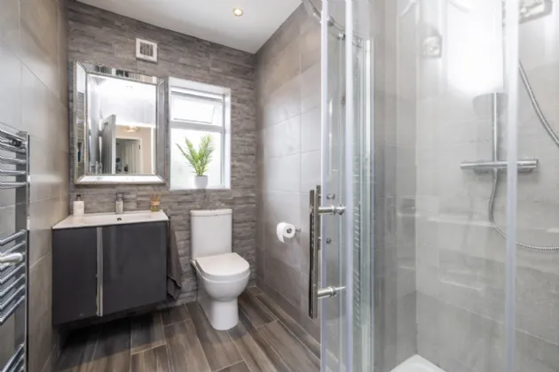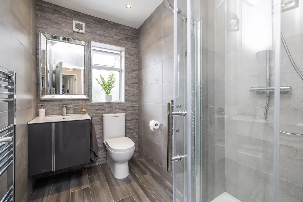 Bathroom 2.11m x 2.33m Beautiful, modern fitted bathroom with wood effect tiles, tiled walls, recessed lighting, W.C, W.H.B, shower, heated towel rail