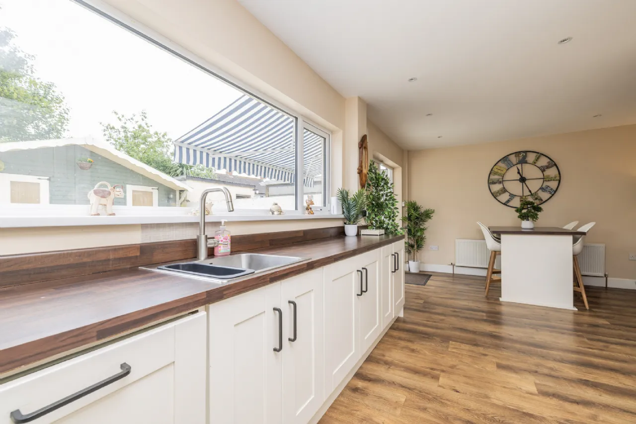 Kitchen / Dining Wonderful open plan space with laminate wood flooring, modern fitted kitchen with an abundance of fitted floor and wall mounted units. The kitchen includes an integrated oven, hob, and extractor fan, with tiled splash back and recessed lighting. The dining area benefits from additional recessed lighting, a freestanding breakfast bar, and French doors that open out to the rear.