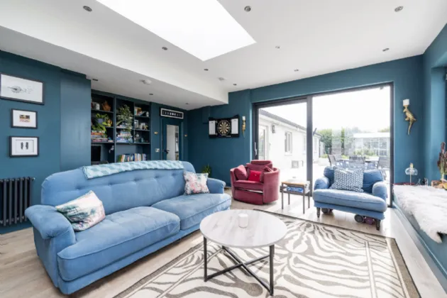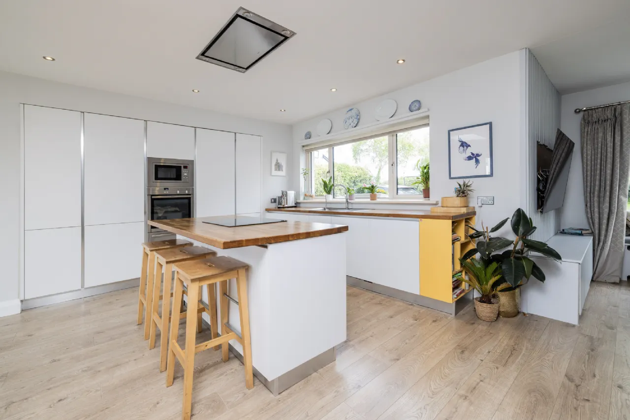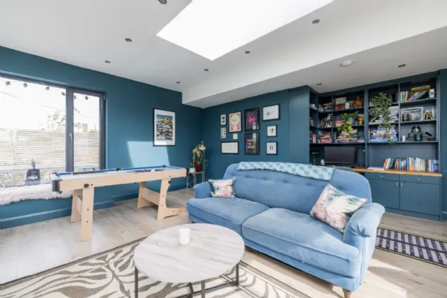 Open plan Kitchen / Living / Dining This superb and generously proportioned open-plan living area is beautifully finished with warm wooden flooring throughout, creating a seamless flow between the kitchen, dining, and living spaces. The kitchen and dining area features recessed lighting and a stylish, fully fitted kitchen complete with ample storage and integrated appliances, including a microwave and oven. A central island with a breakfast bar incorporates an integrated hob and ceiling-mounted extractor fan. French doors open directly onto the rear garden, offering easy indoor-outdoor living. The inviting living area is centered around a charming wood-burning stove, complemented by a cleverly designed built-in fuel storage space. With Velux roof windows, dual-aspect glazing, and French doors, the entire space is bathed in natural light throughout the day, creating a bright and welcoming atmosphere ideal for both relaxing and entertaining.