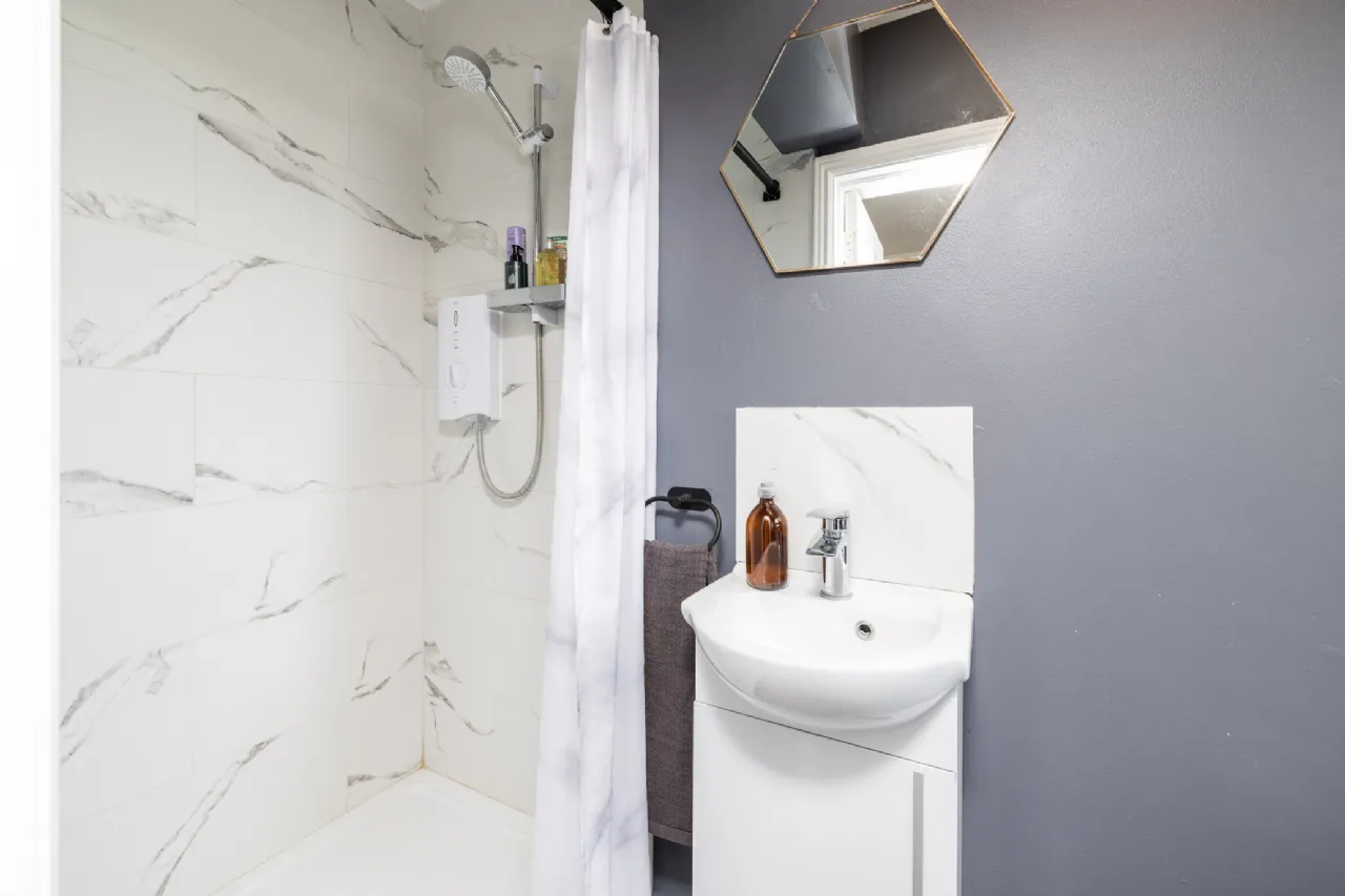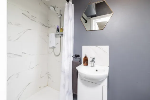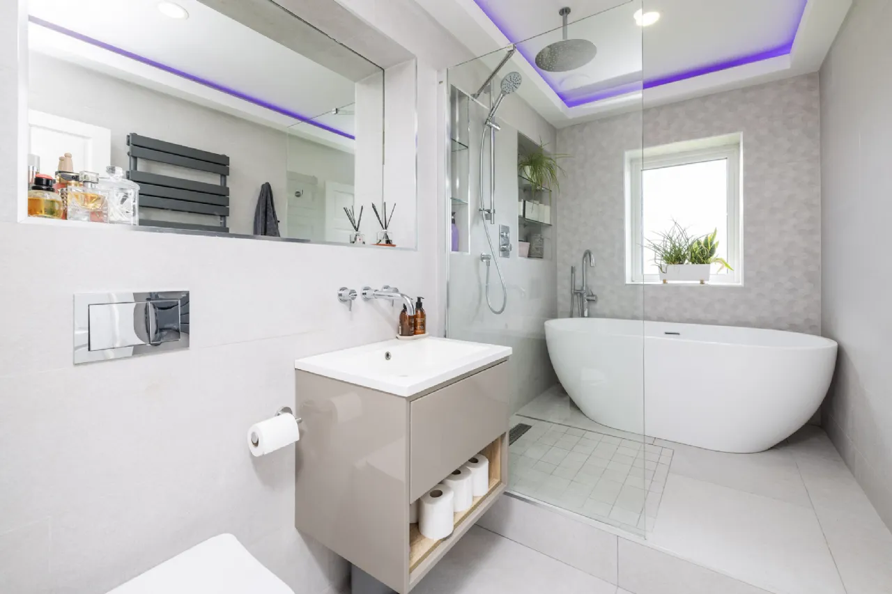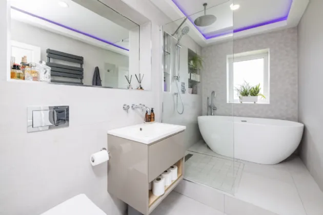 Family Bathroom 1.70m x 3.42m This beautifully appointed modern bathroom features a sleek, fully tiled finish complemented by recessed LED lighting for a clean, contemporary ambiance. The suite includes a freestanding bath, separate shower, W.C., and wash-hand basin, all thoughtfully selected to combine both style and functionality—perfect for relaxing in comfort and luxury.