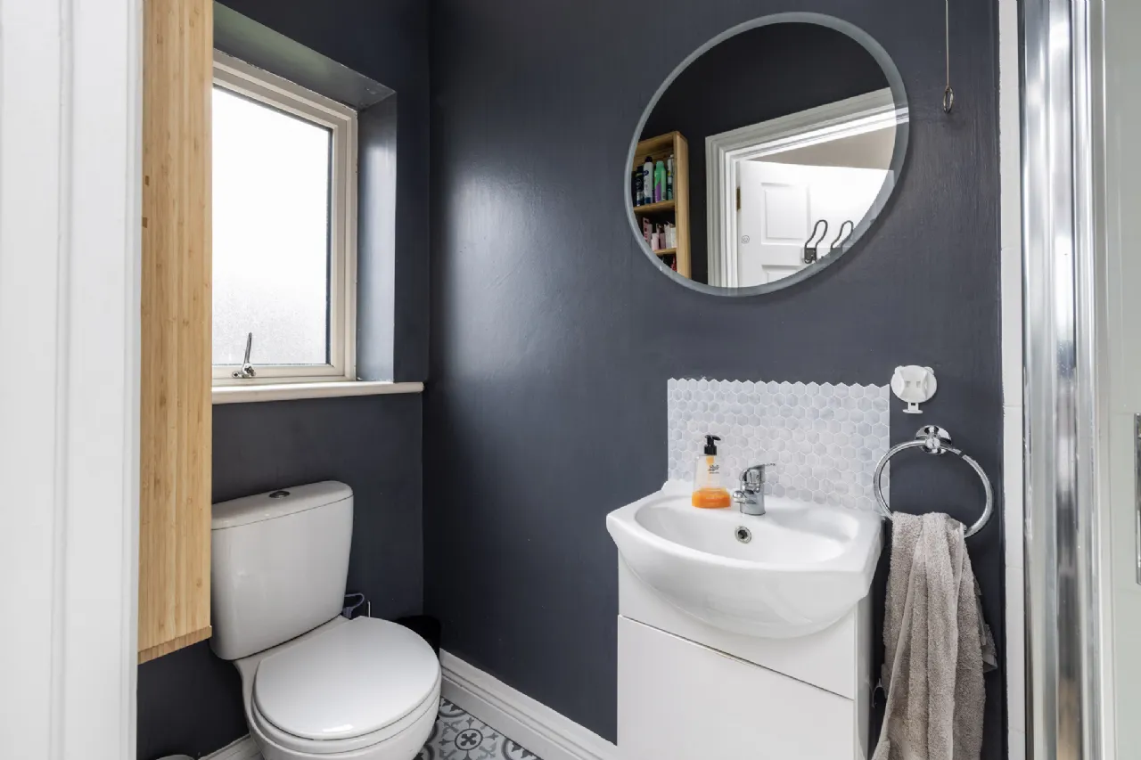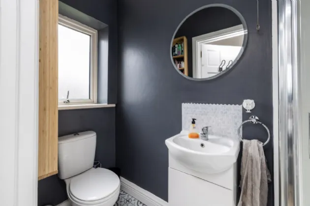 Guest W.C 3.06m x 1.17m With tiled flooring, W.C., W.H.B and shower unit.