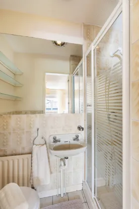 Family Bathroom 1.9m x 1.6m Fully tiled floor, fully tiled walls, whb, w.c, bath with Triton T90xr electric shower. Heated towel rail.