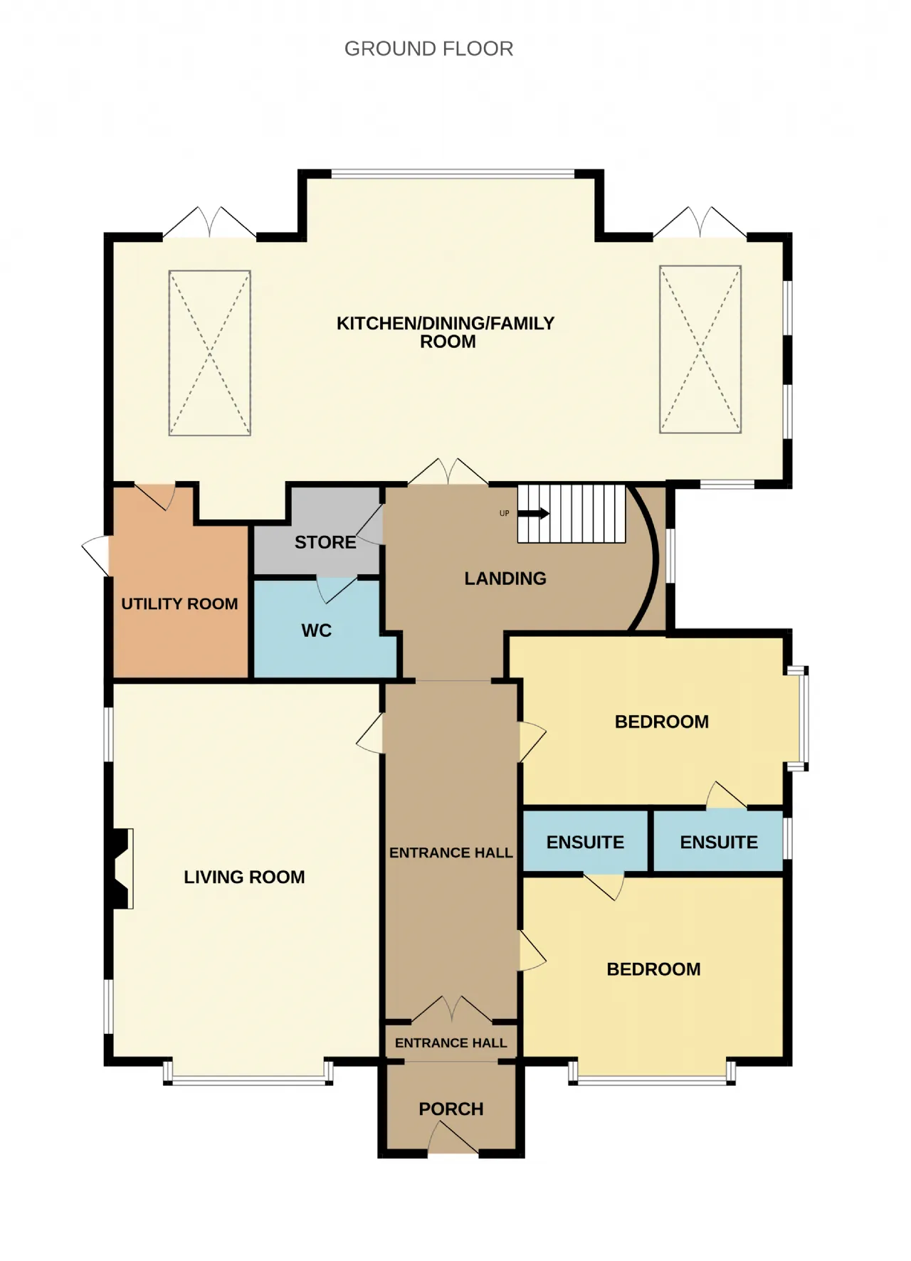 The family area is enhanced by attractive wall panelling and a dedicated TV space, while two sets of double doors open onto the beautifully landscaped rear garden, creating a seamless indoor-outdoor flow. At ground floor level, there are two generously sized ensuite bedrooms, offering excellent flexibility for family living or guests.