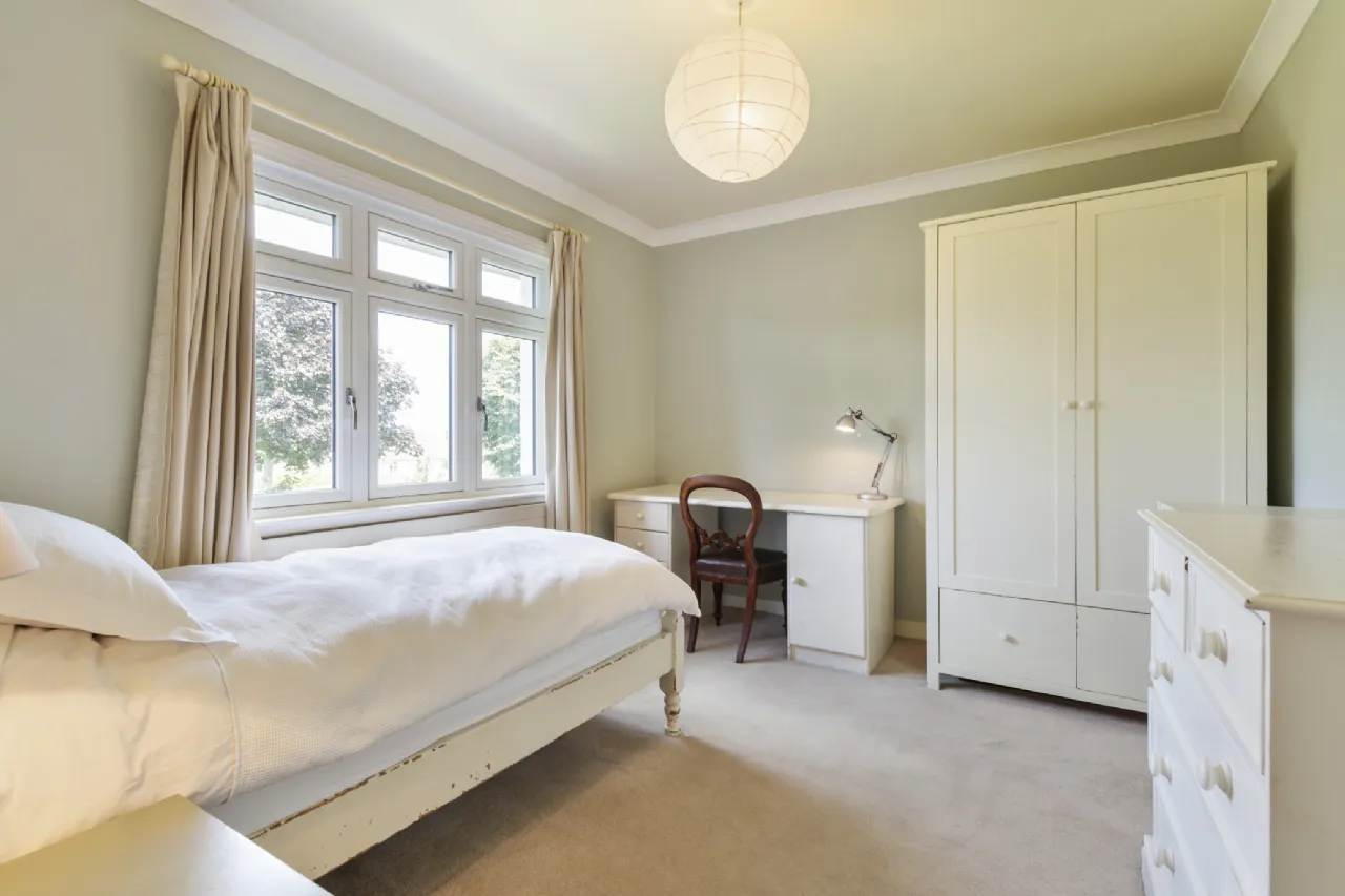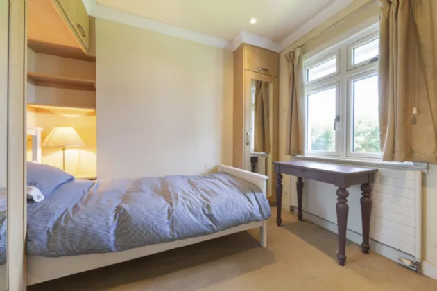 Bedroom 4 2.92m x 2.60m Single bedroom to the rear with extensive built in wardrobes, carpet flooring, ceiling coving and window.