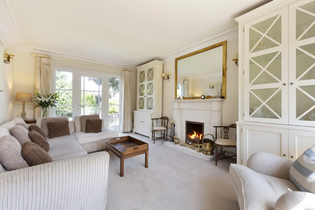 Living Room 5.60m x 3.62m To the right of the hall is a lovely bright room which is dual aspect with window to the front and French door to the rear garden, a feature cream marble fireplace with open fire and marble hearth, carpet flooring, ceiling coving and wall lights.