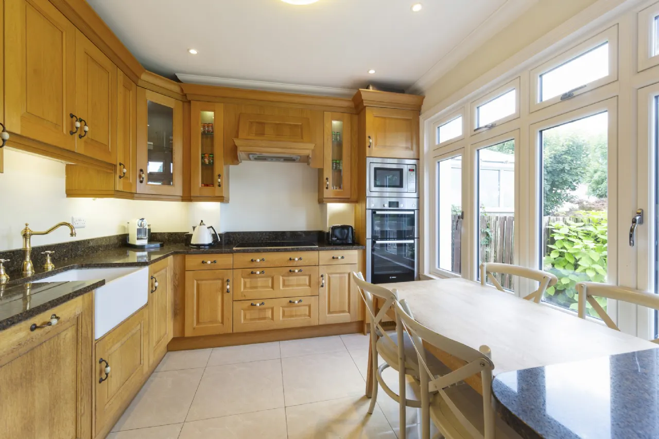 To the rear of the property is the kitchen/breakfast room which has lovely country style cabinetry finished in Oak with complimenting marble worktops and splash back with a Belfast sink and all integrated Bosch appliances. There is space for a table and chairs and a very good range of wall and floor cabinets. The window overlooks the rear garden and a door leads outside. There is also a guest wc off the kitchen.