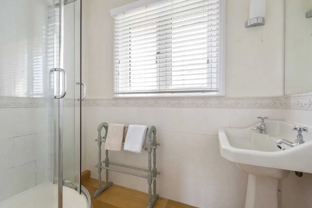 Shower Room Wooden flooring, window to the front with shutters, step in shower cubicle with Mira electric shower, wash hand basin with mirror over.