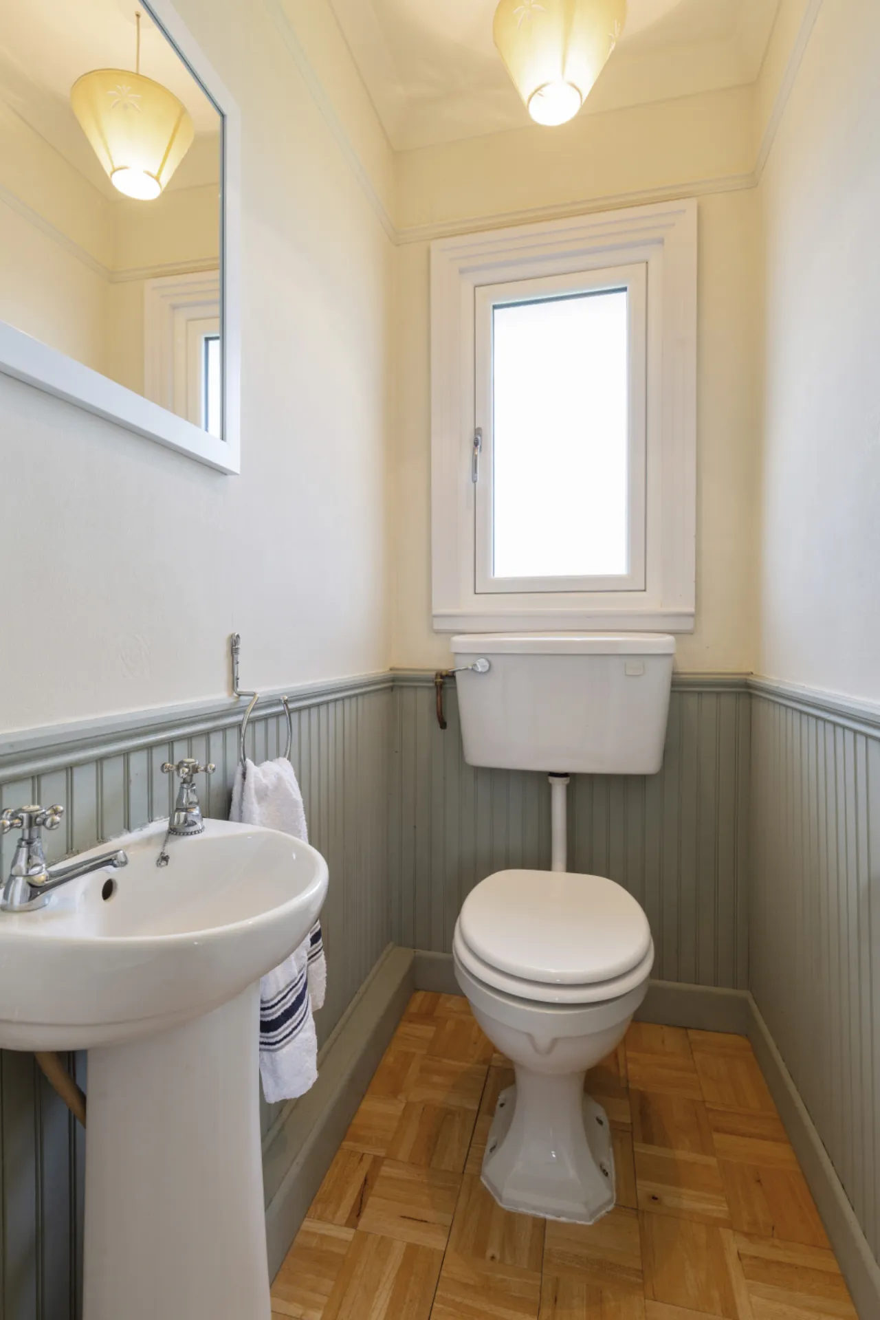 Separate WC Wooden flooring, wc, wash hand basin with mirror, partially panelled walls and window.