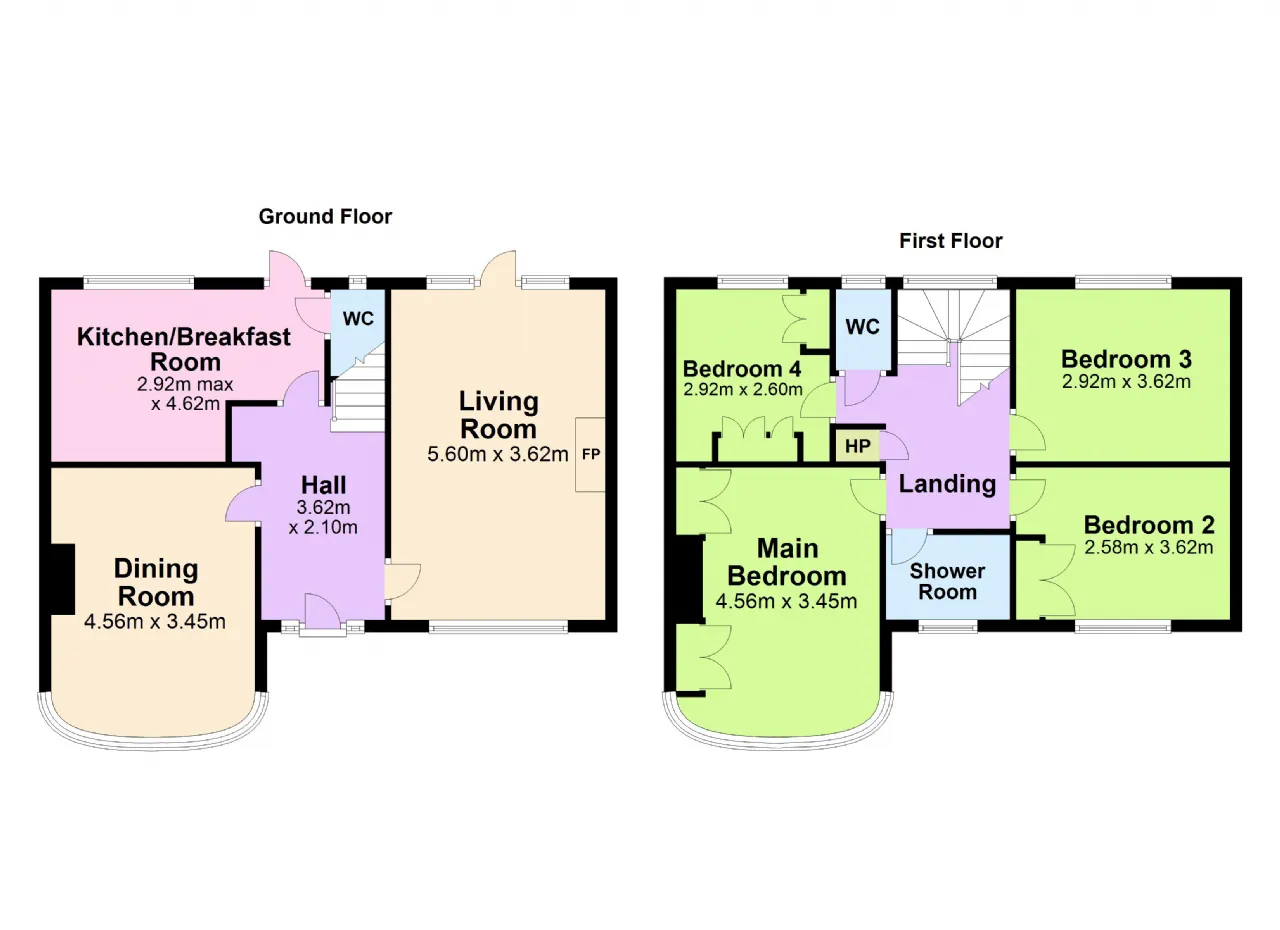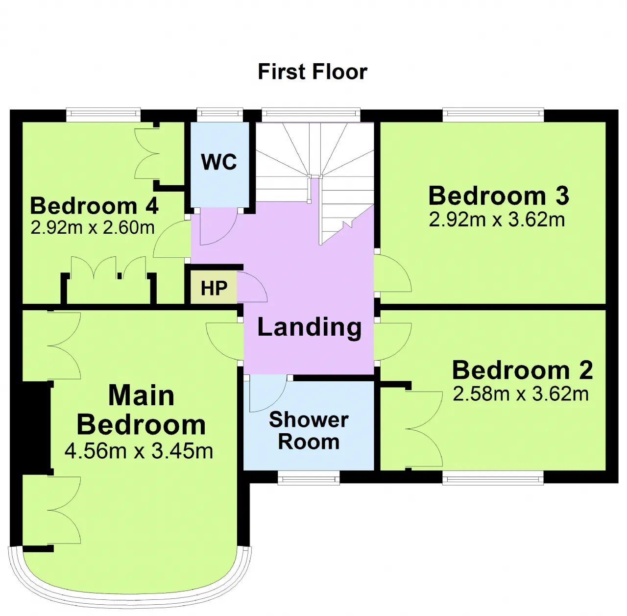 Bedroom 1 4.56m x 3.45m Double bedroom to the front with feature bay window like downstairs, carpet flooring and ceiling coving.
