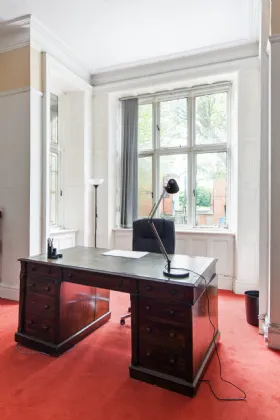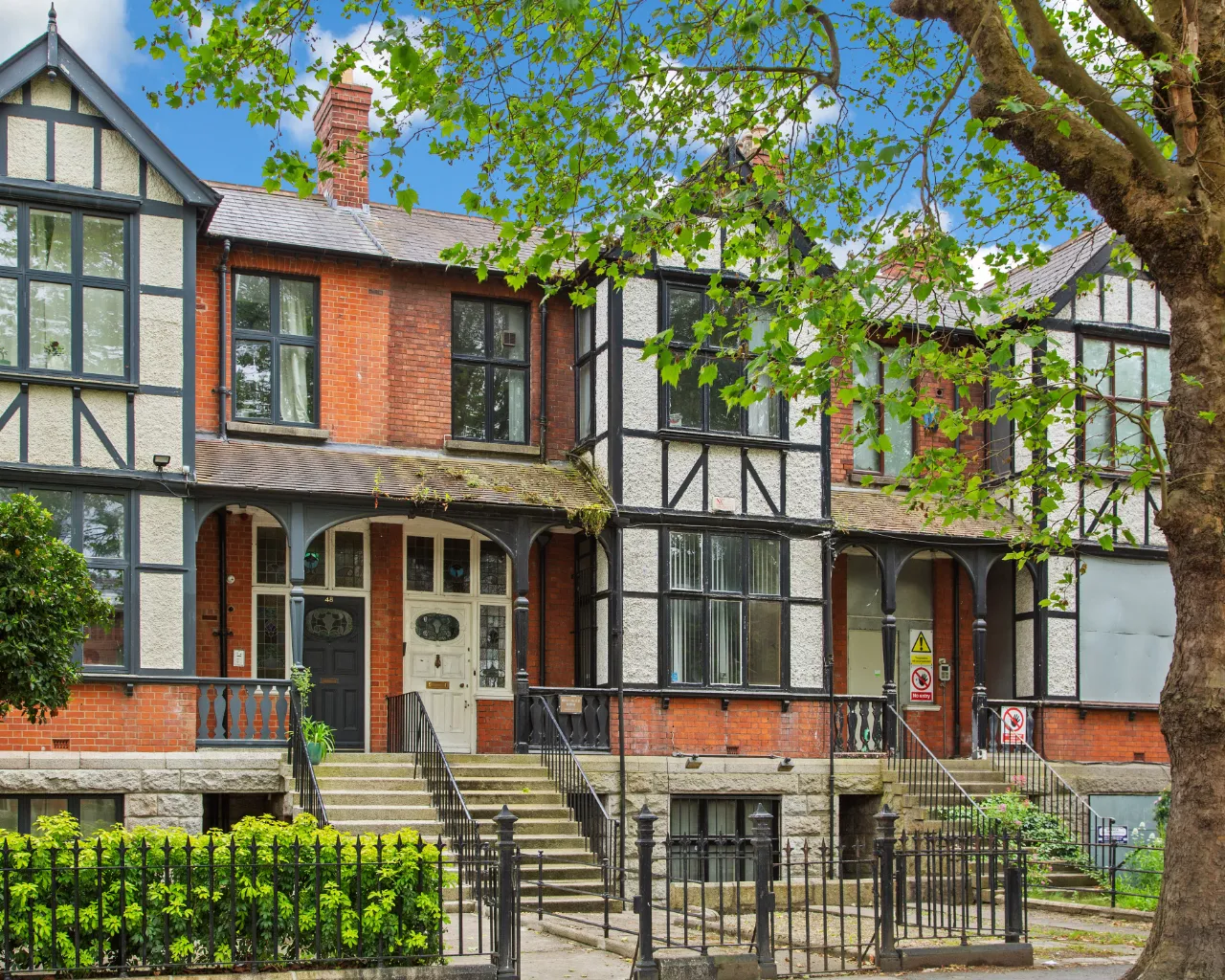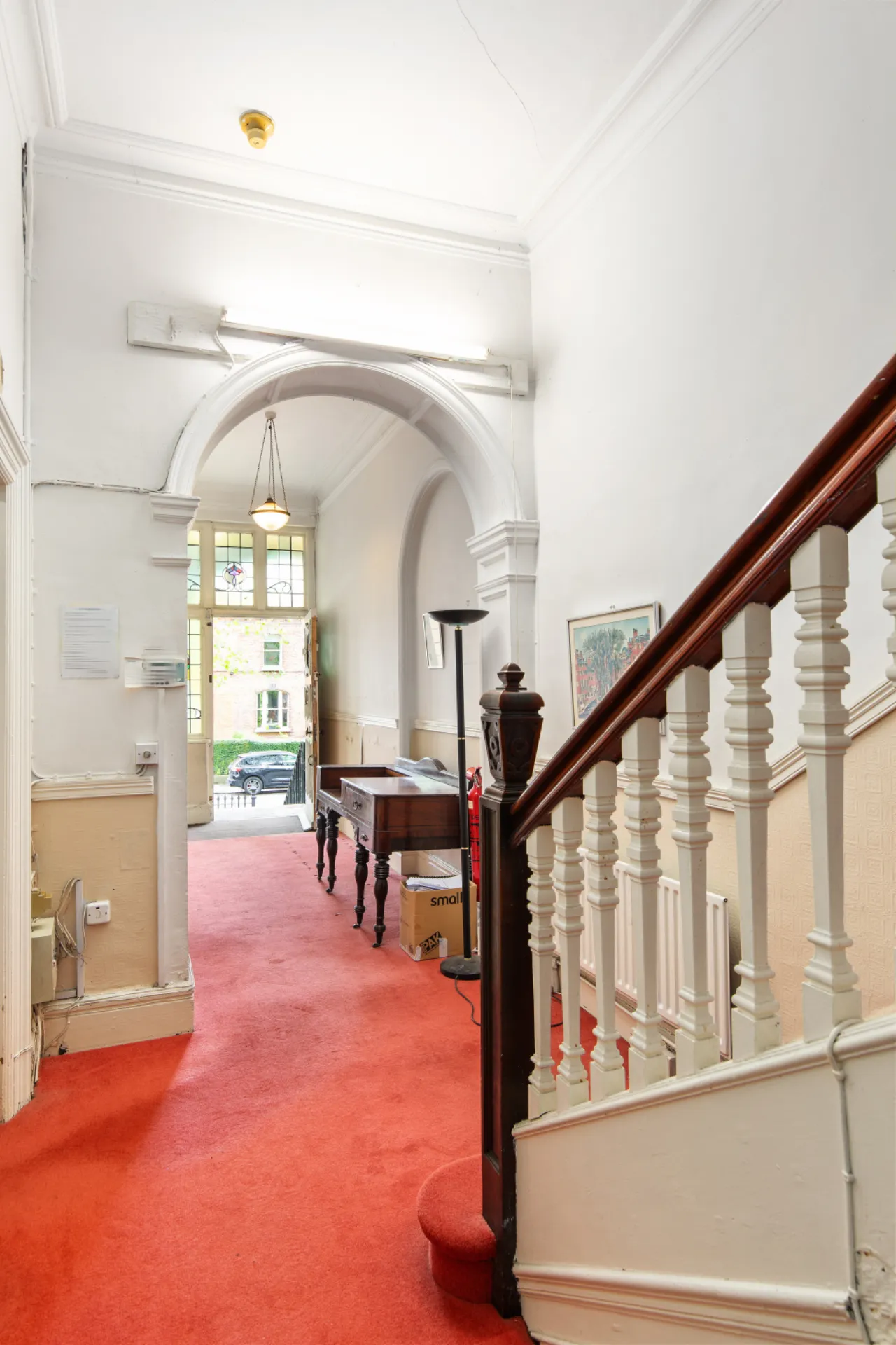 Reached by an impressive set of granite steps which lead to a covered porch, a stained glass door leads to the hallway which is a very generous size with high ceiling and beautiful plasterwork. There are two reception rooms at this level both with high ceilings, the room to the front has a bay window flooding the room with light while the reception room to the rear boasts a beautiful original marble fireplace. On the return there is another large room used as an office and guest w.c. Up a wide staircase on the return there is an office while on the first floor there are three large rooms with high ceilings, the main room has a bay window, all three rooms have ornate cast iron fireplaces. Another flight of stairs leads to a fourth return where there is a kitchen. At garden level with its own separate entrance, there is a hallway leading to three very large rooms and a shower room.