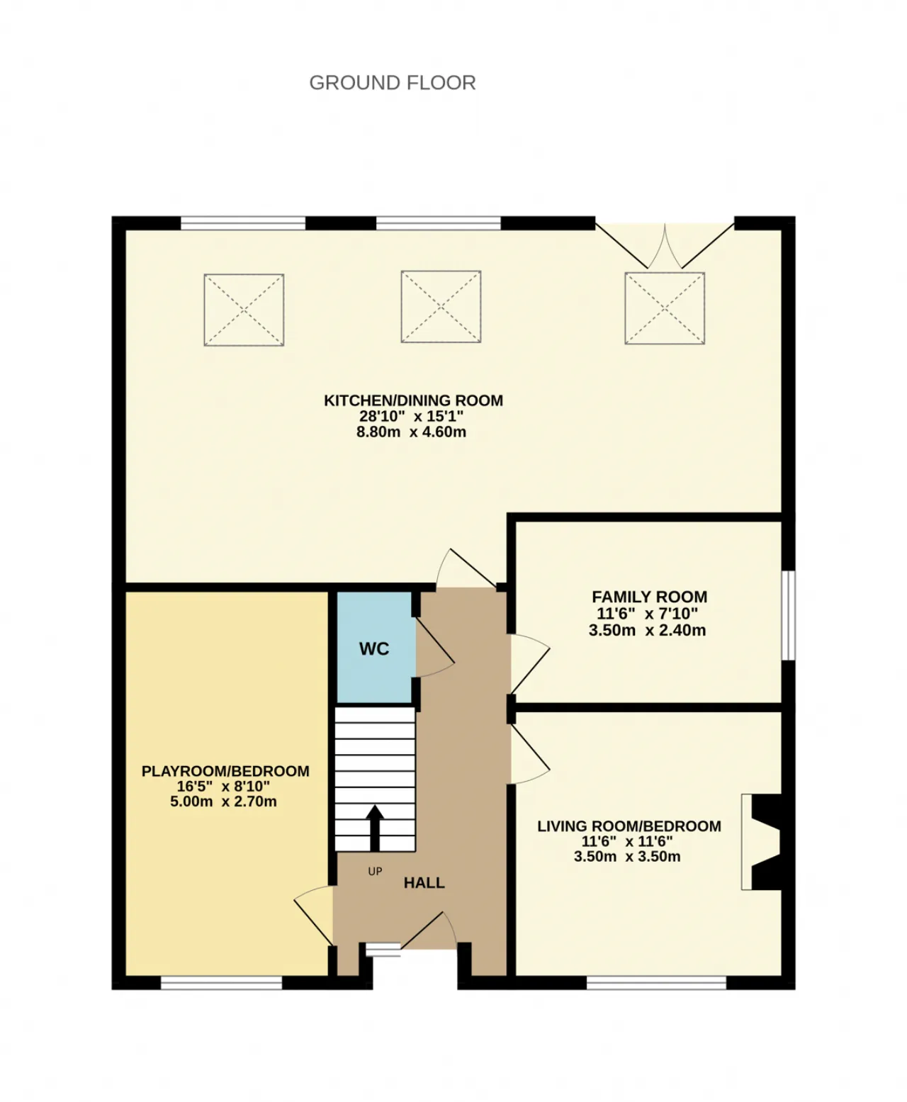 Kitchen/Dining Room 4.60m x 8.80m Spacious open-plan layout with tiled flooring, tiled splashback and three Velux windows providing additional natural sunlight. There is an extensive array of fitted kitchen units, ample built in storage and double-glass doors to the rear garden.
