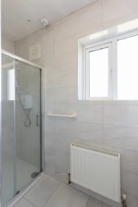 Bathroom 2.6m x 1m A newly fitted, tiled bathroom featuring a modern vanity unit and an electric shower, offering a fresh and contemporary finish.