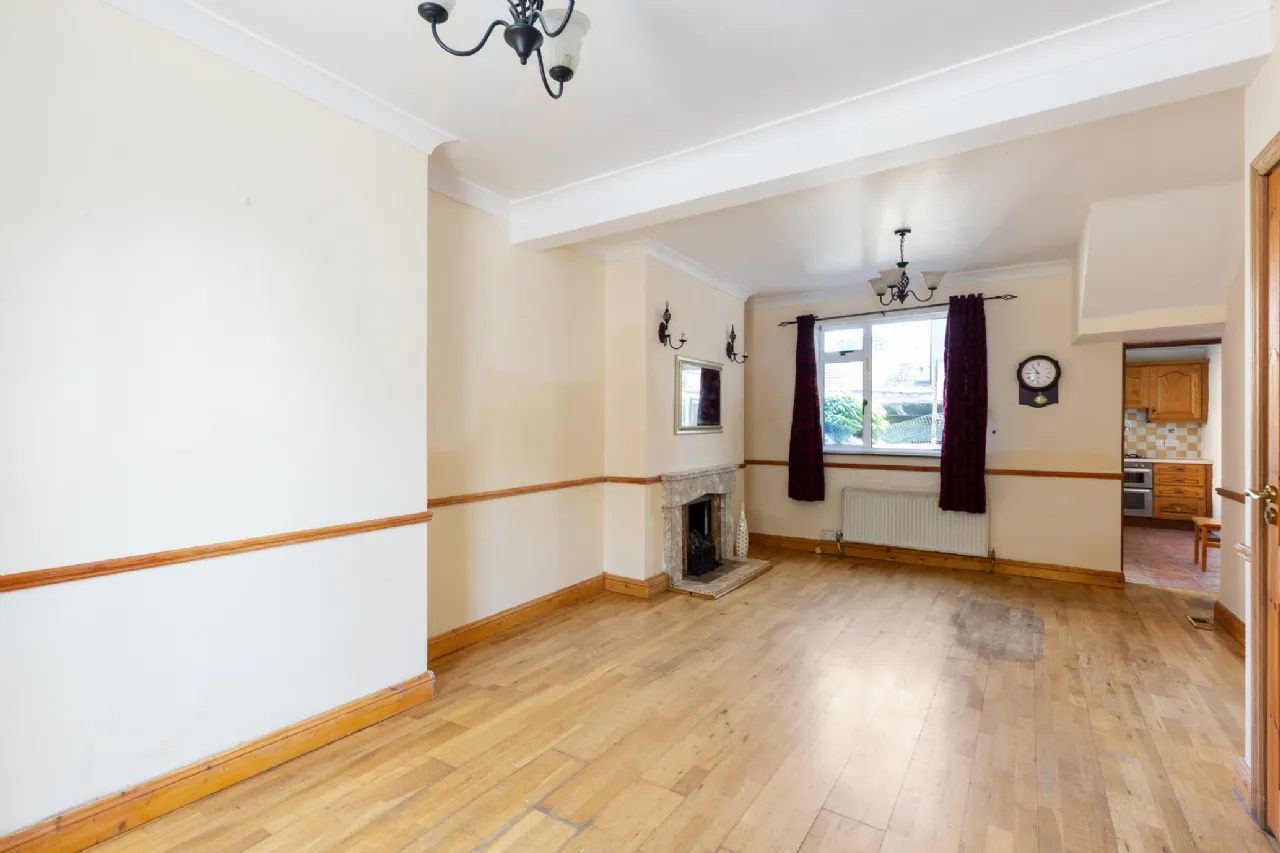 Living /Dining Room 6.3m x 3.3m Spanning the full length of the original house, this impressive room features an open fireplace, decorative coving, and an ornate ceiling rose, all adding to its period charm and generous proportions.