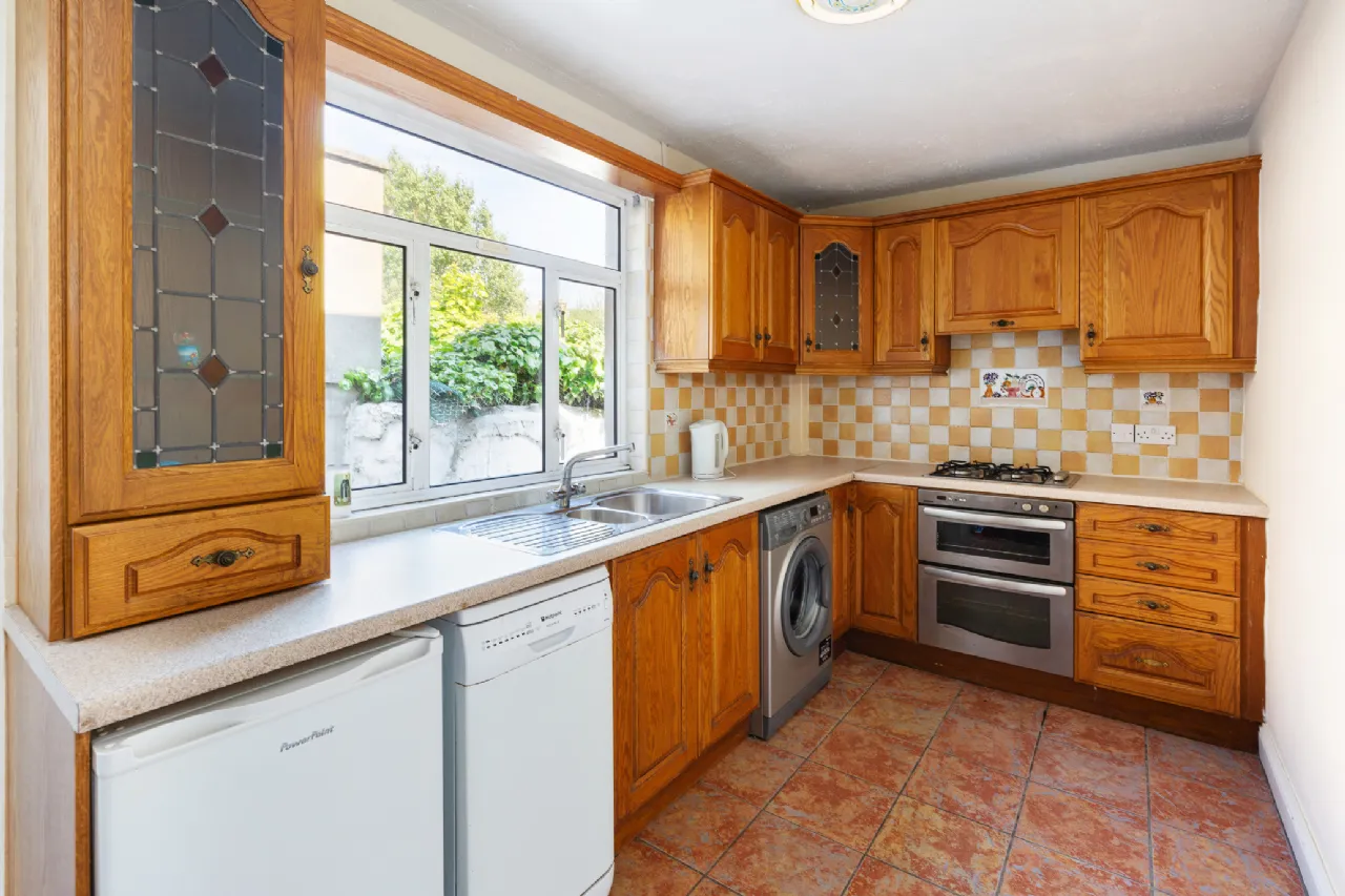 Kitchen 4.5m x 2.1m A fitted kitchen to the rear of the property, complete with oven, gas hob, extractor fan, and washing machine. The tiled floor adds practicality, and a door opens directly to the courtyard beyond.