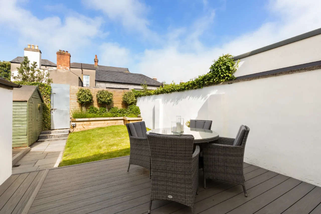 Garden To the front, the garden is bordered by wrought iron railings with steps to the front door set back from the road. The south-west facing rear garden (35 ft in length approx.) is light-filled and an ideal space for al fresco dining or relaxing, The garden is laid in lawn with large low-maintenance composite decking area and raised flower beds. There is a separate area to BBQ and a barna shed for additional storage. There is gated pedestrian access to a rear laneway.