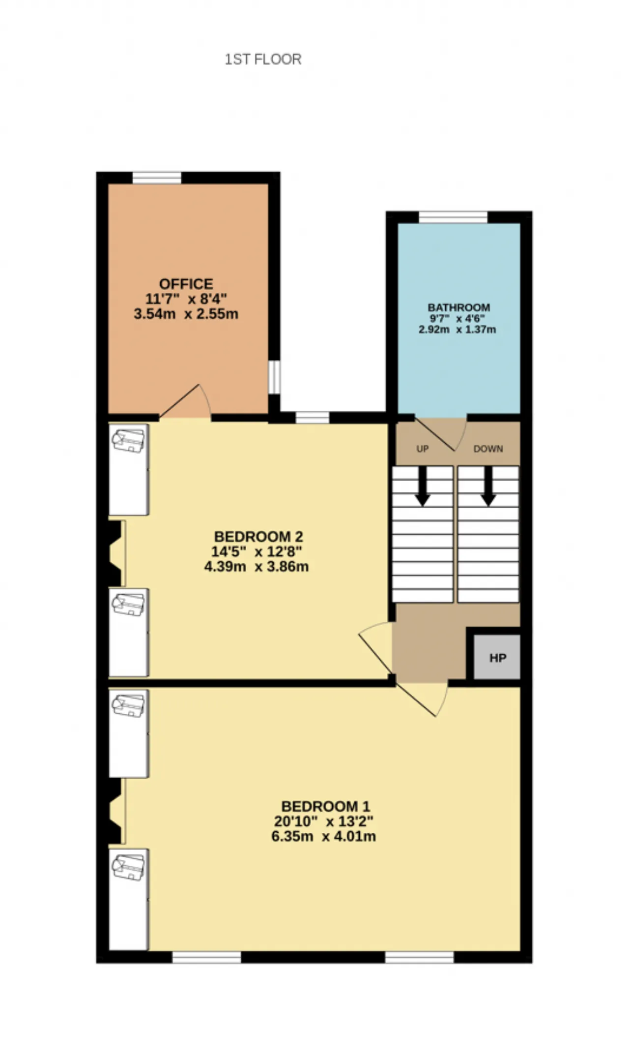 Bedroom 1 6.35m x 4.01m Double bedroom spanning the width of the property overlooking the front with built in wardrobes and fireplace with tiled surround