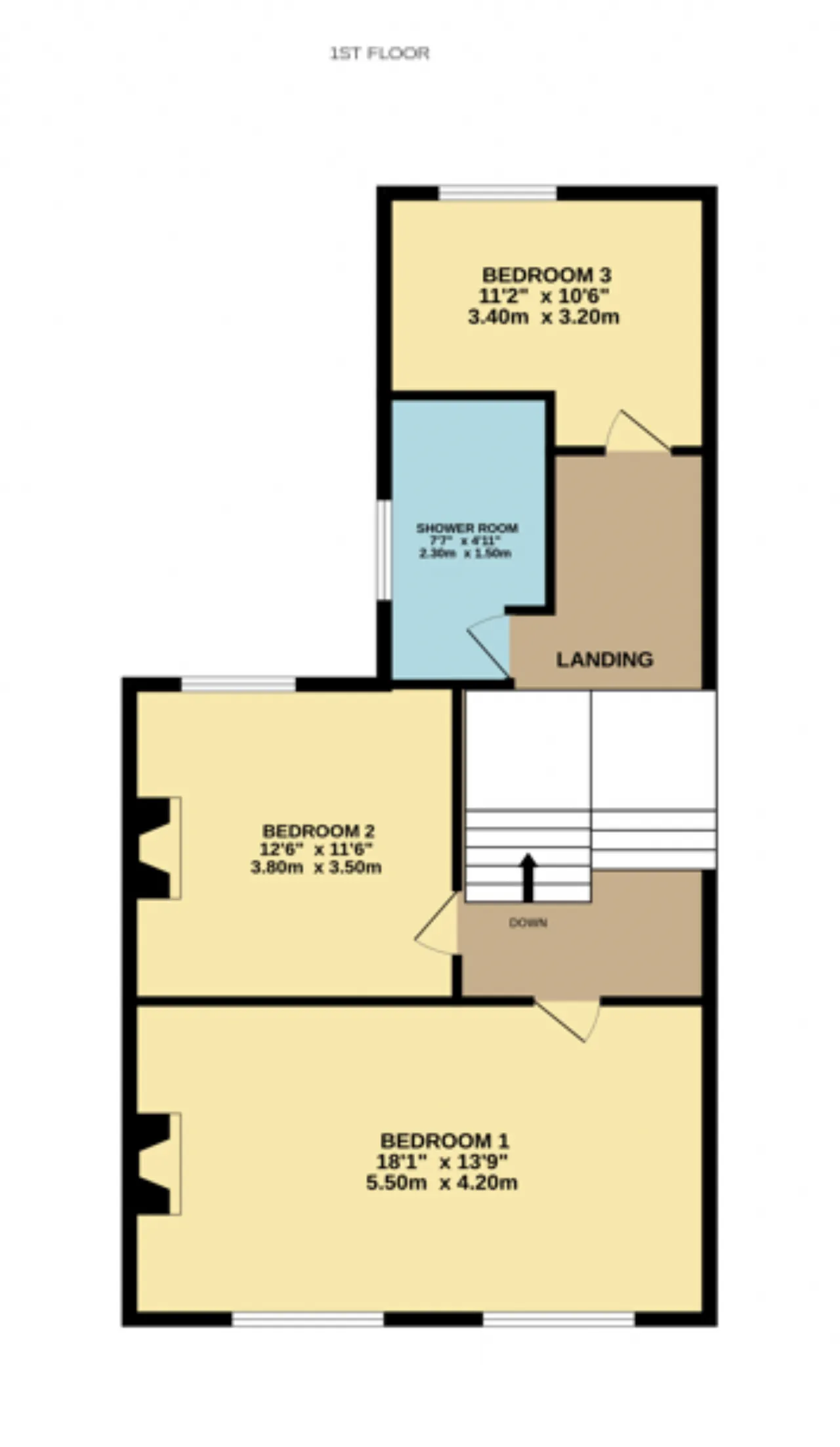 Bedroom 1 5.5m x 4.2m Magnificent main bedroom spanning the width of the property and lit by two large windows. The ceiling is high and original features include a marble fireplace. There is a great range of fitted wardrobes and storage.
