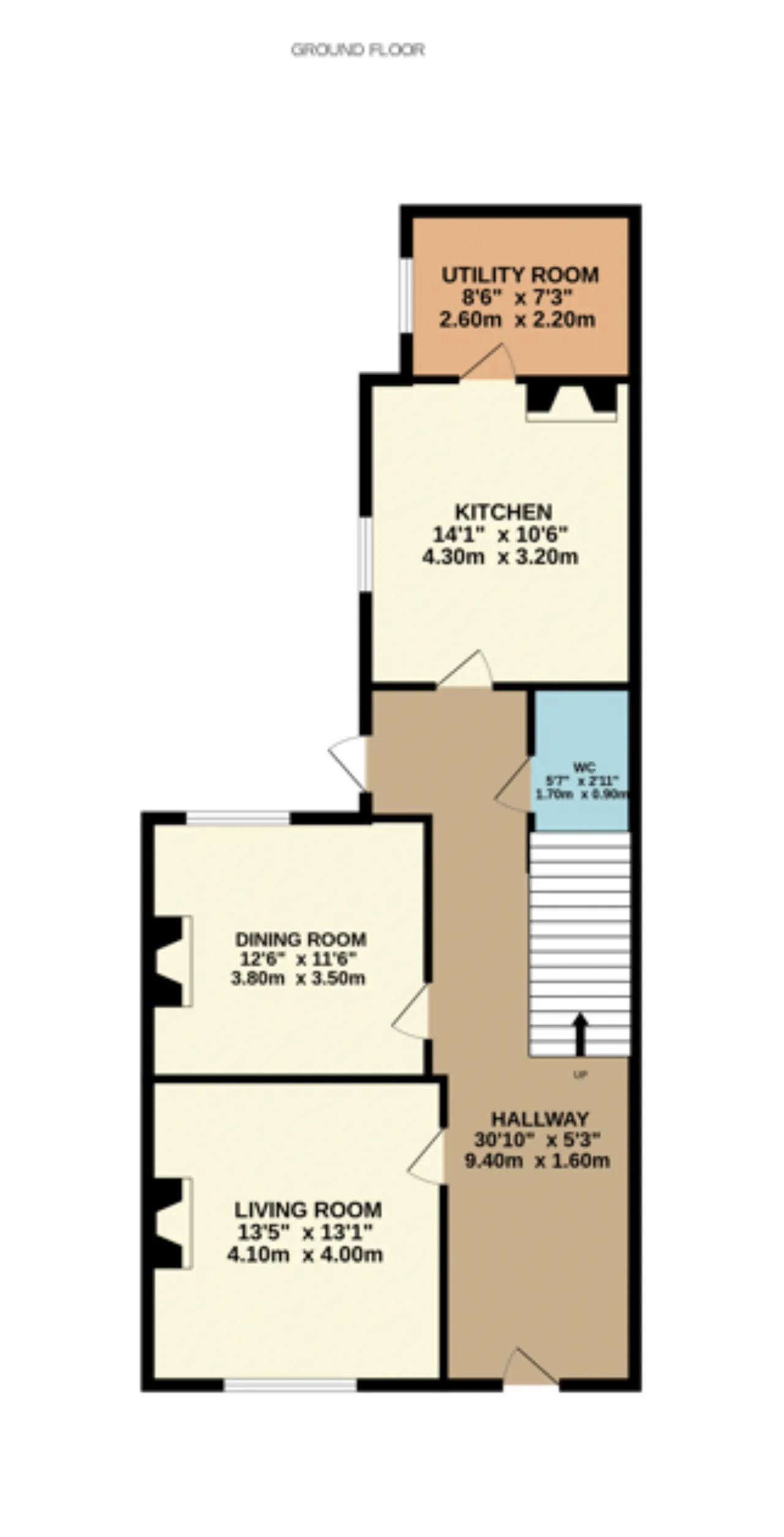 The accommodation comprises a large entrance hallway with original features and a useful guest w.c, two reception rooms, the living room to the front has a beautiful original marble fireplace and large window with original shutters. The dining room to the rear is also a spacious room with cast iron fireplace and a view of the rear garden. The kitchen has a modern range of floor and wall units with plenty of space for a dining table. A utility room is located off the kitchen and provides extra storage space.