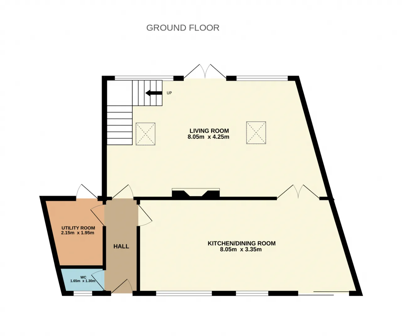 Living Room 8.05m x 4.25m Double height living space, double-height and full-width glass to rear garden, timber floor, stove, recess lights, TV point, 2 x Velux windows, French doors out to rear garden, stairs to first floor