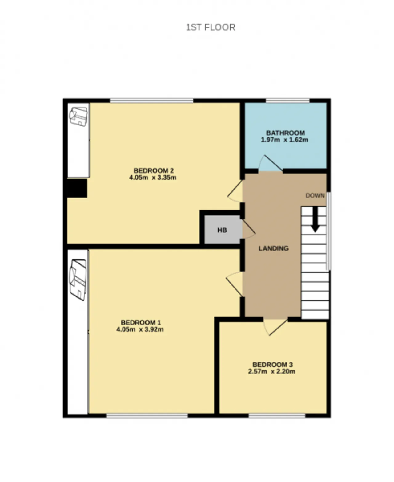 Bedroom 1 4.05m x 3.92m Generous double bedroom to the front, includes built-in wardrobes and additional shelving, varnished wood flooring.