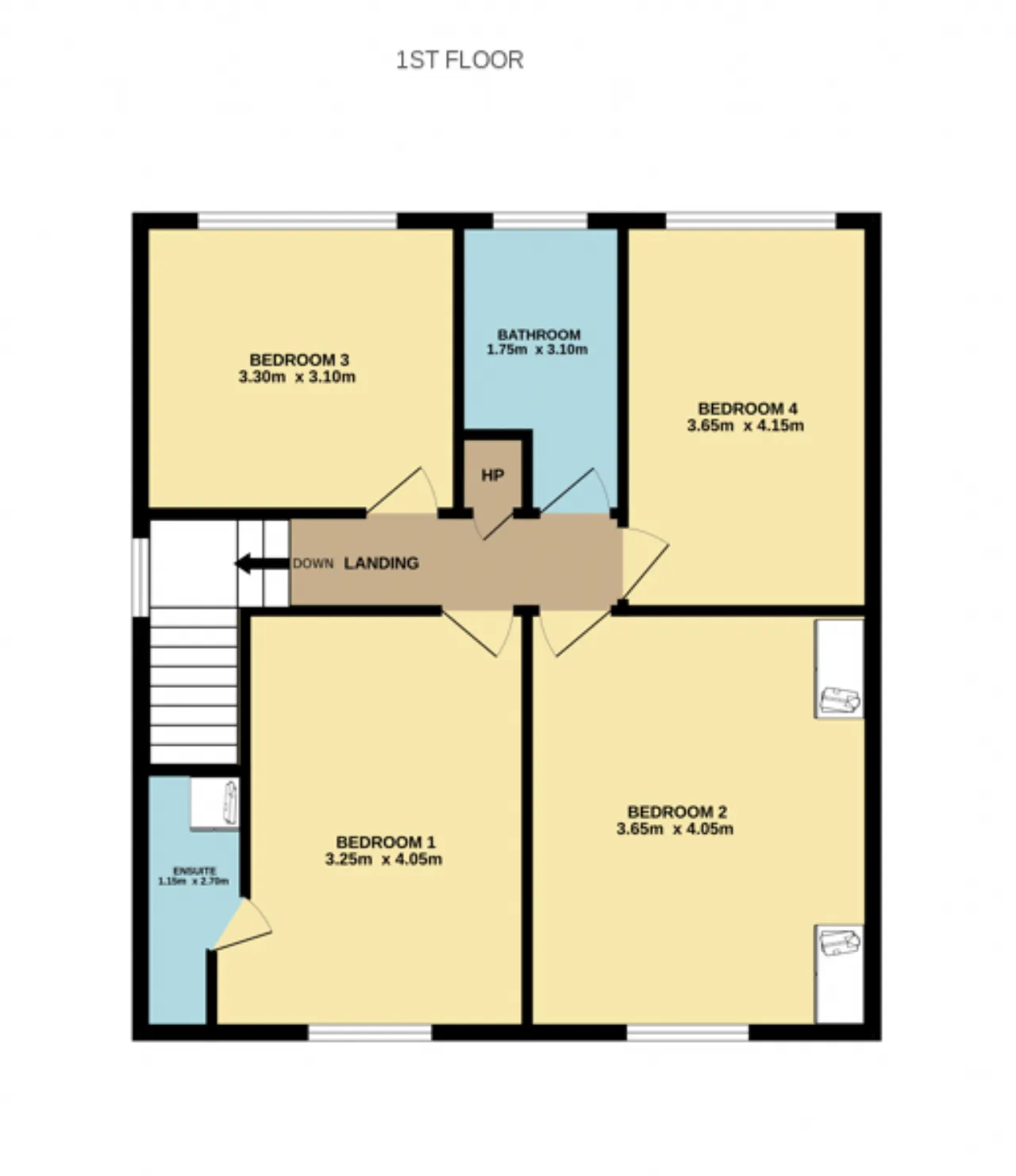 Bedroom 1 3.25m x 4.05m Double to front with ensuite, carpet, storage press
