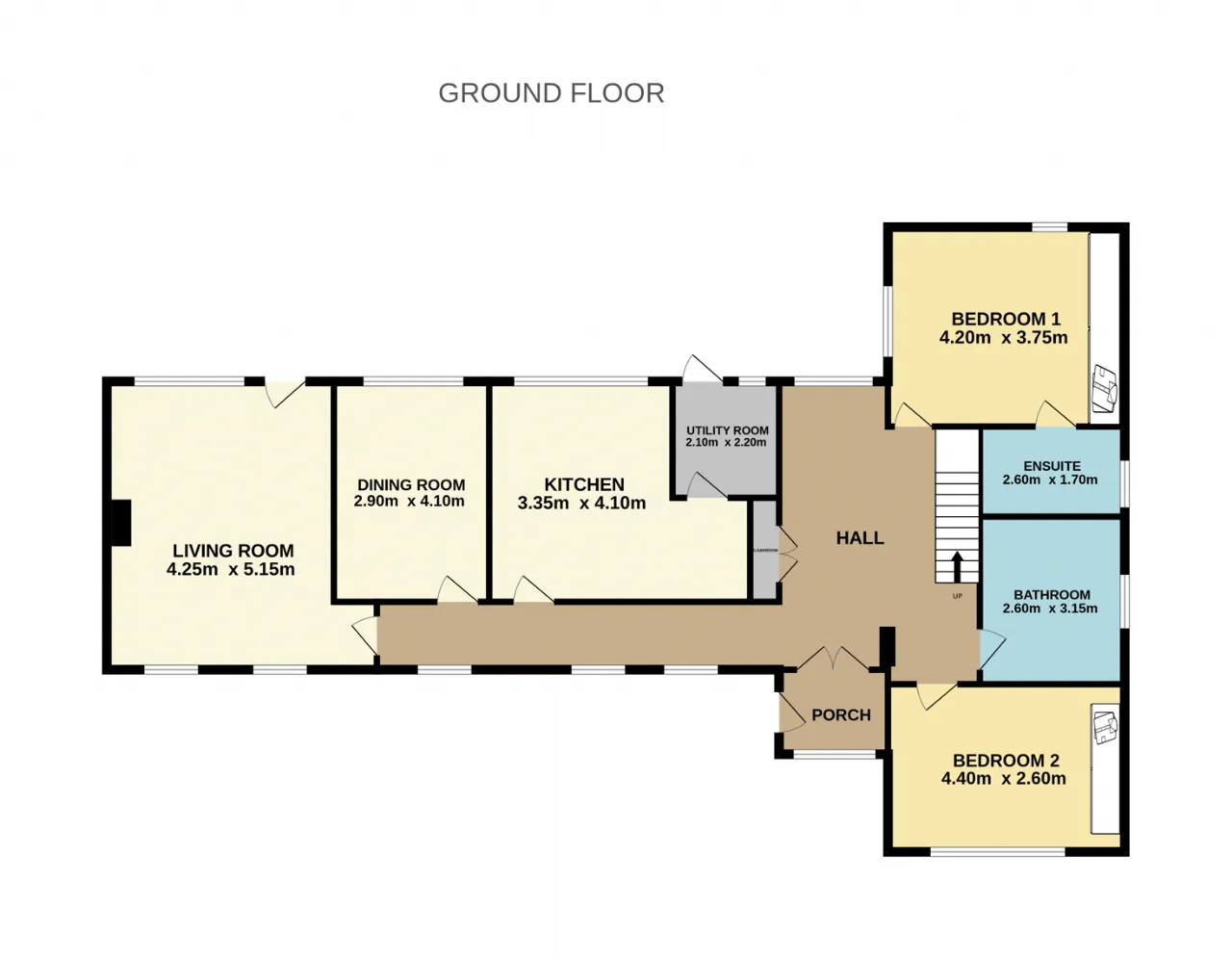 En-Suite 2.6m x 1.7m Wash hand basin, W.C., electric shower, towel rail, part-tiled walls, tiled floor