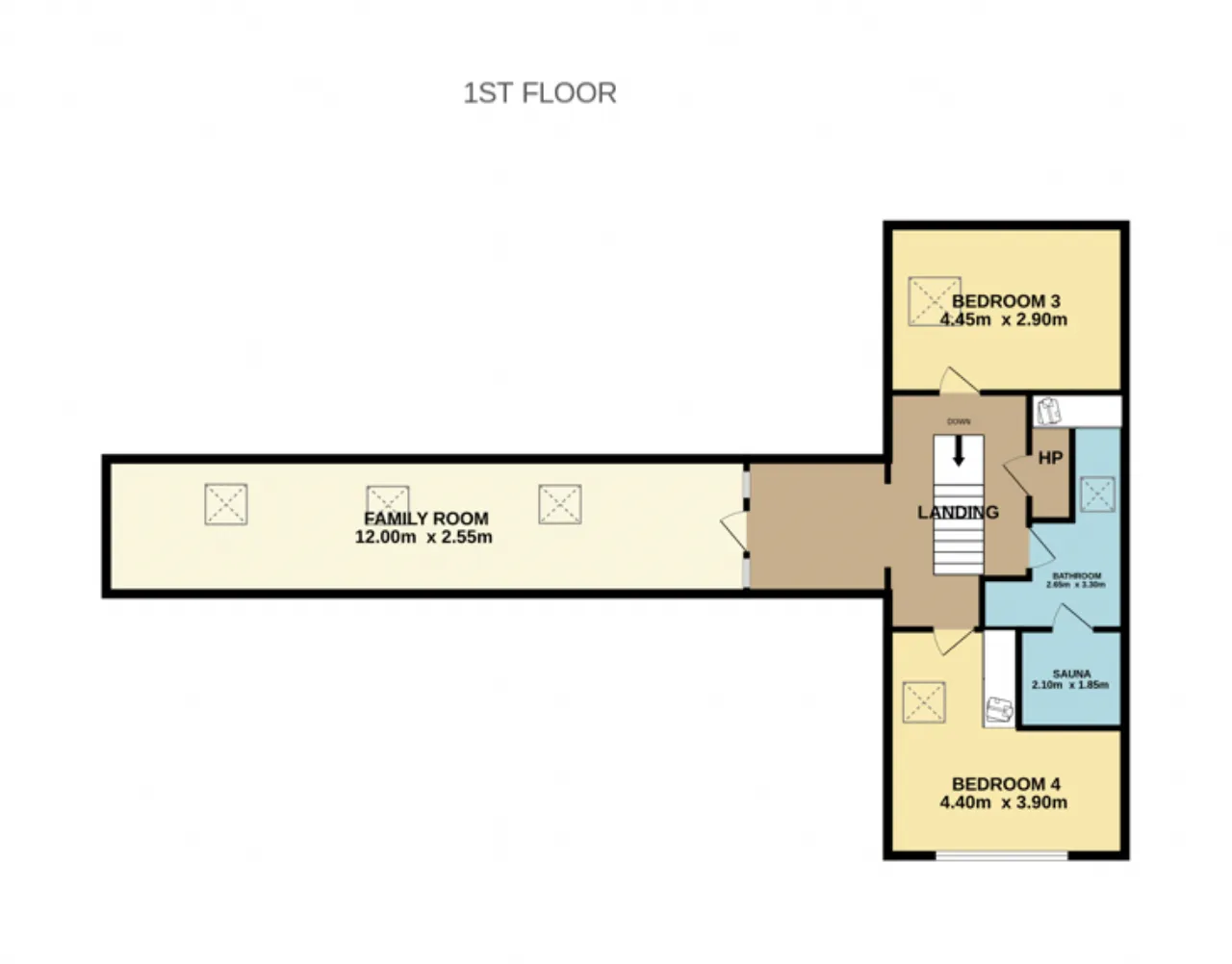 Family Room 12.0m x 2.55m Carpet, TV point, fitted units, storage, phone point, 3 x sky lights