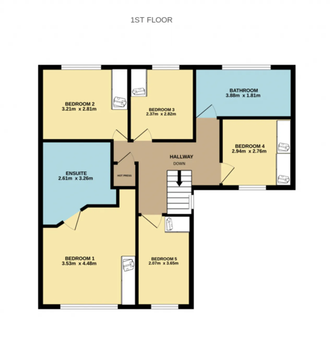 Bedroom 5 2.07m x 3.65m Overlooking front garden and green area opposite the property, with carpet flooring and fitted wardrobes.